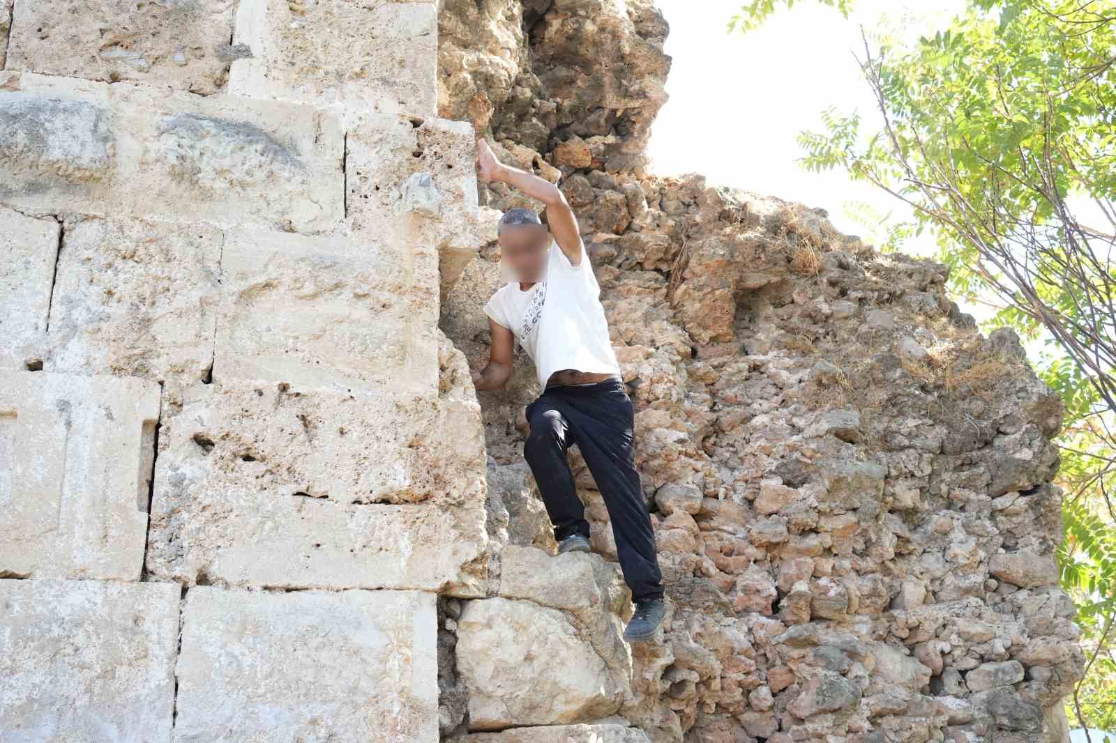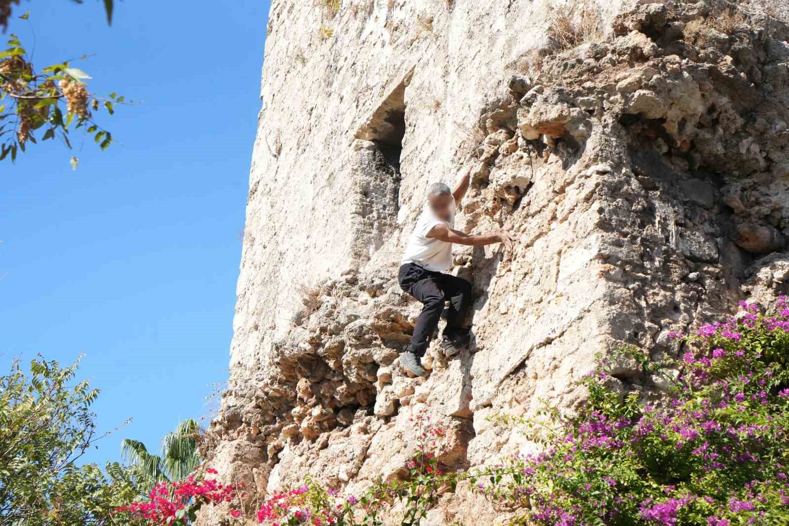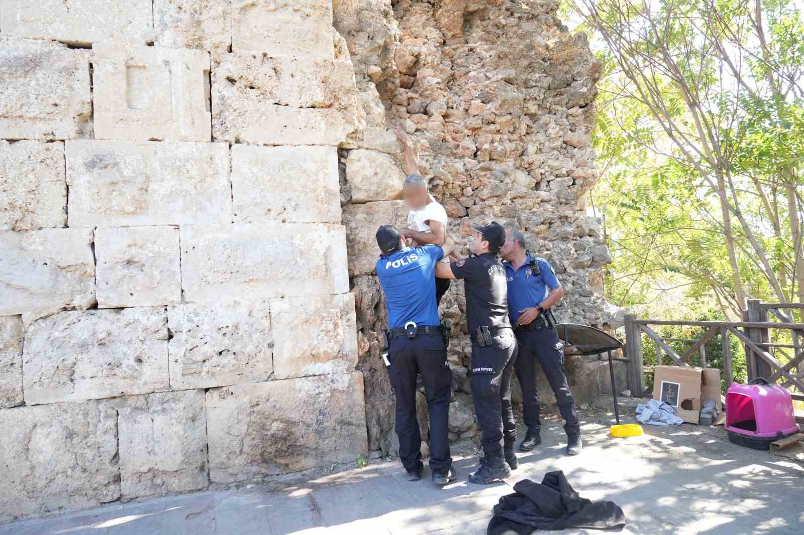 Antalya’nın turistik merkezi Kaleiçi’nde surların üzerine çıkıp “15-16 yaşındaki çocukları silahlandırdılar” diye bağıran şahıs, polisi alarma geçirdi. Ekiplerin yardımıyla surdan aşağı indirilen şahıs, ambulansla hastaneye kaldırıldı.