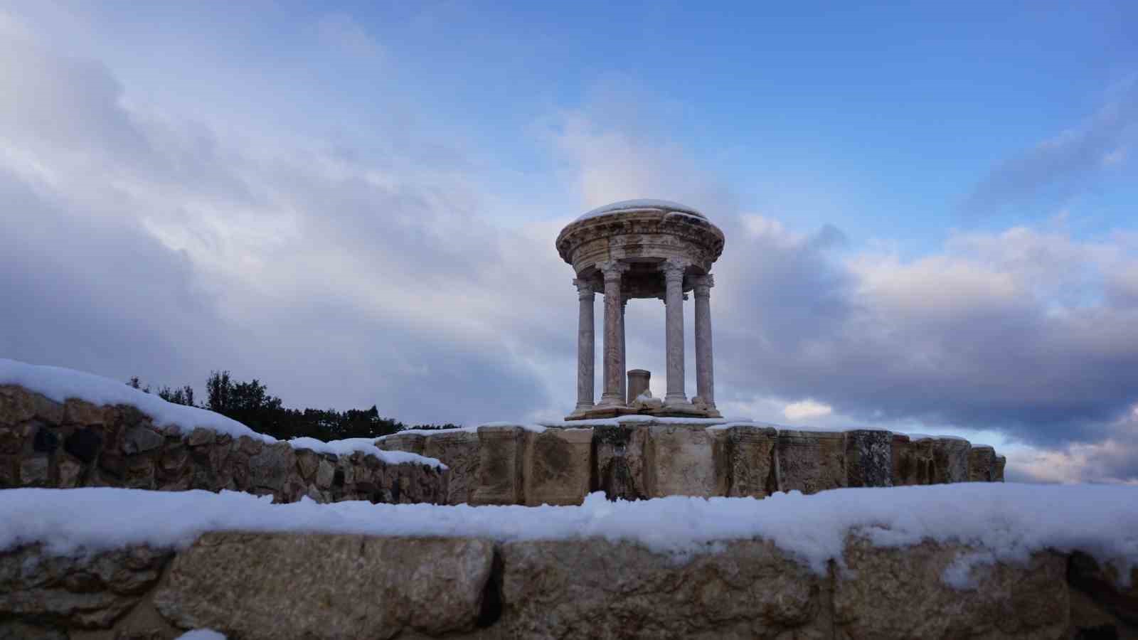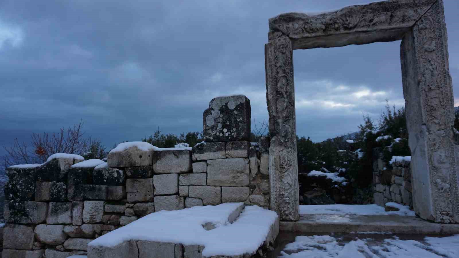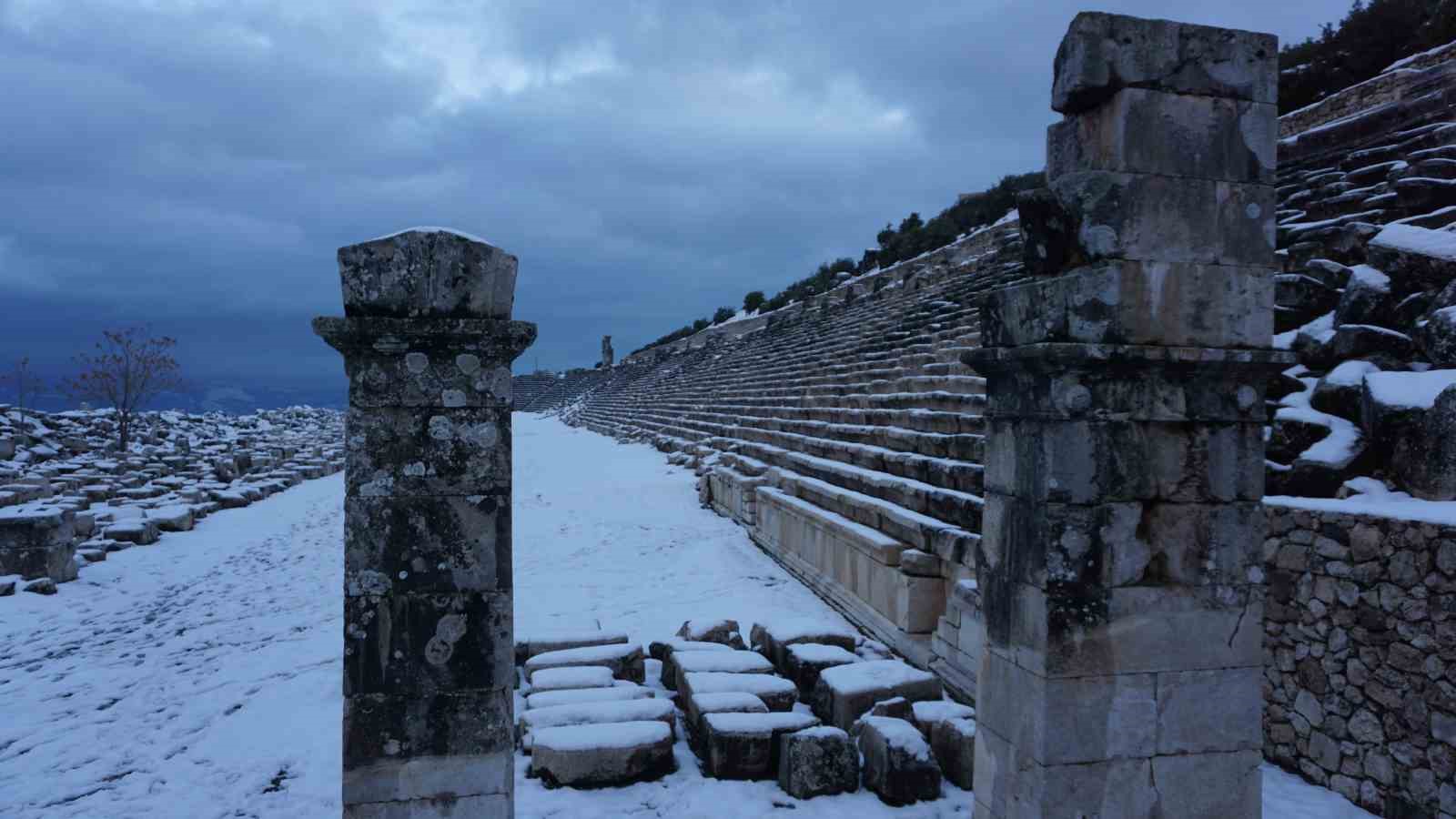 Tarihte gladyatörler şehri olarak bilinen ve Anadolu’nun saklı cennetlerinden biri olan Kibyra Antik Kenti, tarih ve arkeoloji meraklılarını kendine hayran bırakıyor. Burdur’un Gölhisar ilçesinde yer alan bu antik kent, Roma Dönemi’ne ait yapıları ve ihtişamıyla etkileyici. Helenistik dönemden Osmanlı’ya kadar uzanan çok katmanlı yapısıyla dikkat çeken kentte kazı ve restorasyon çalışmaları sürüyor. Geçtiğimiz günlerde yoğun kar yağışı sonrası beyaza bürünen Kibyra, fotoğraf ve video çekmek isteyen ziyaretçilerin ilgisini çekti.