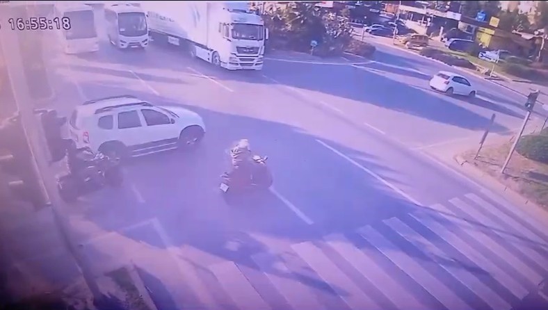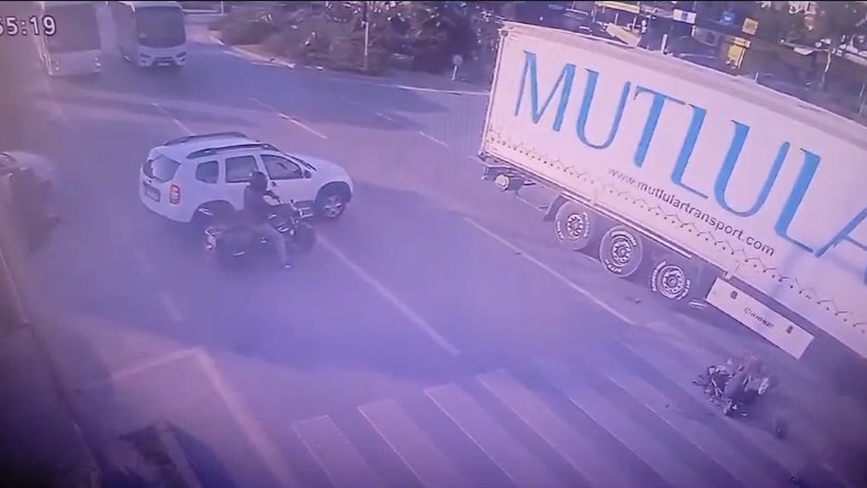 Kırmızı ışıkta geçen tırın, yolun karşısına geçmek isteyen motosiklet sürücüsü ile çarpışma anı ise güvenlik kamerasına yansıdı.