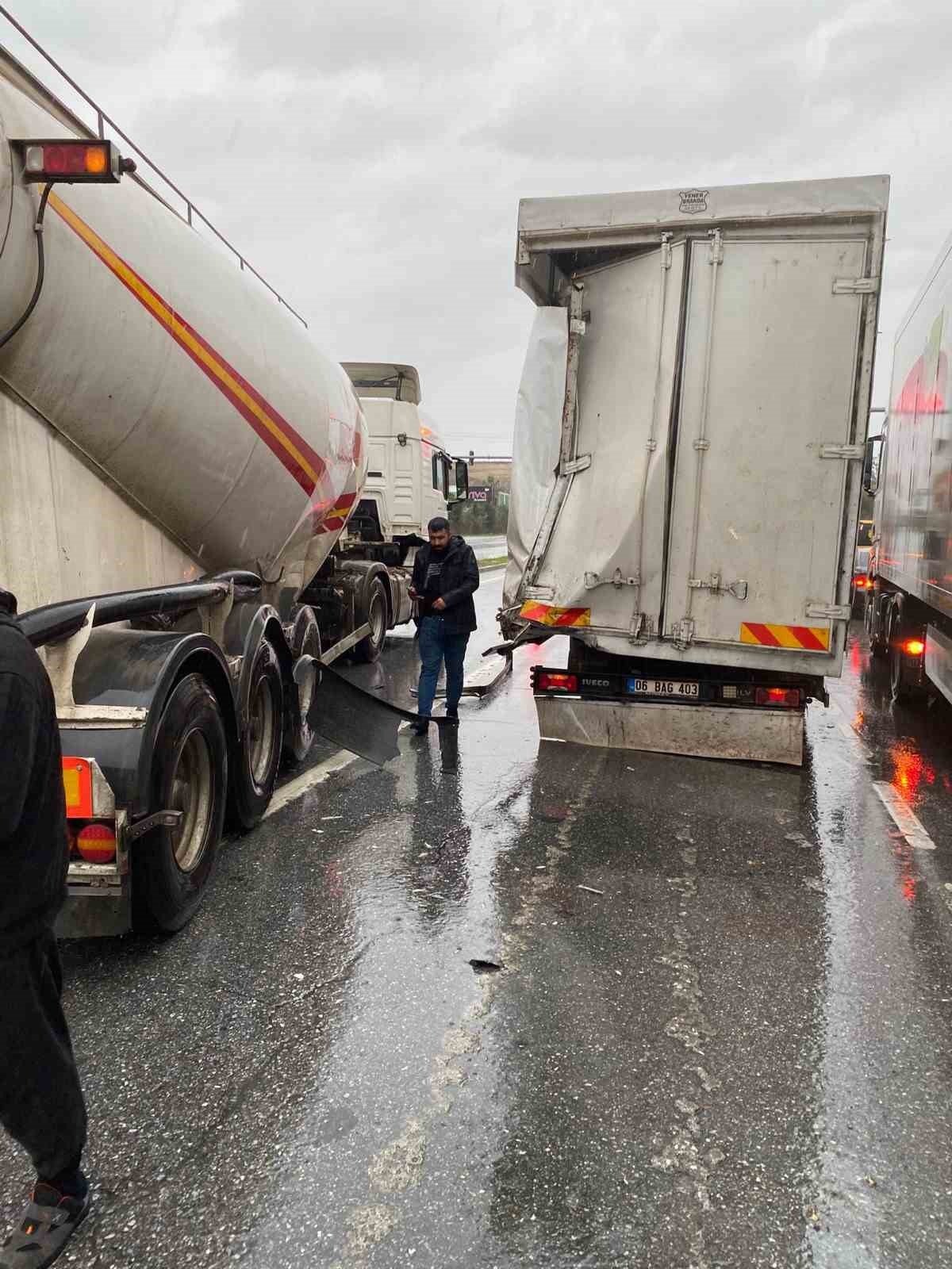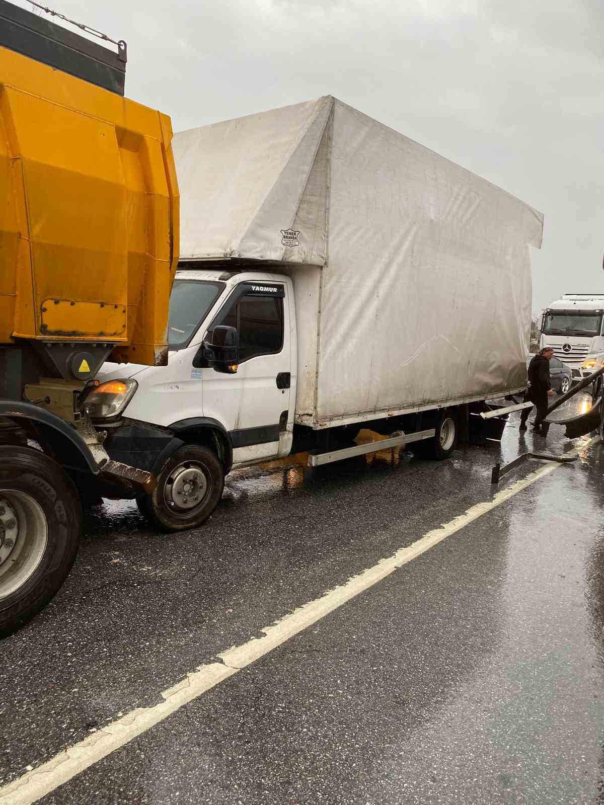 Manavgat’ta ışık sisteminde beton mikserinin kırmızı ışıkta bekleyen kamyonete, kamyonetin de önünde bulunan damperli kamyona çarpması sonucu meydana gelen zincirleme kazada şans eseri yaralanan olmadı.
