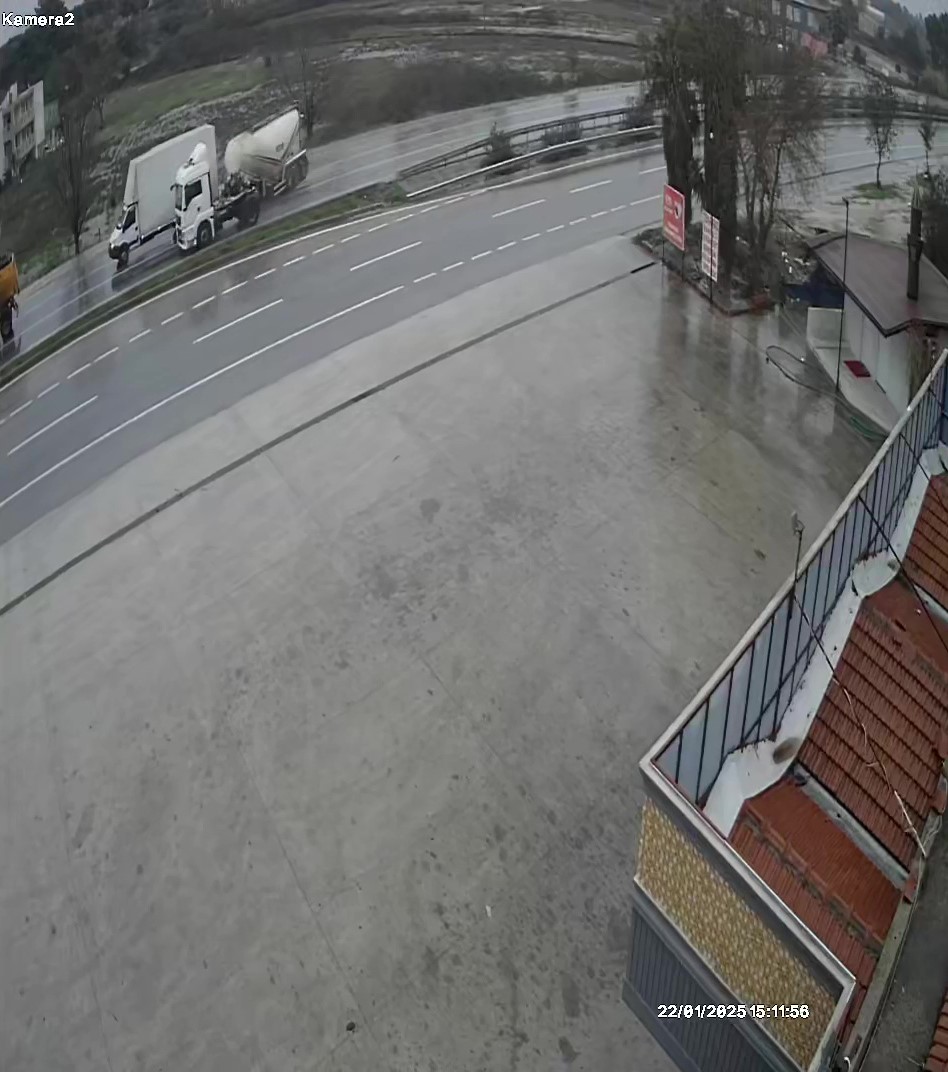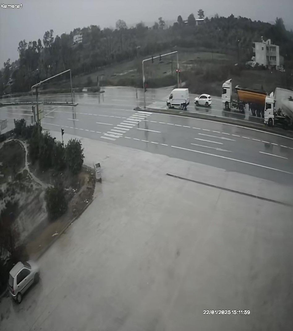 Güvenlik kamerasına saniye saniyesine yansıyan ve 3 aracın karıştığı zincirleme kaza, Alanya-Manavgat D-400 Karayolunda meydana geldi. Alanya’dan Manavgat istikametine seyir halindeki beton mikseri Tekandız mevkiinde bulunan trafik ışıklarına geldiğinde duramayarak, kırmızı ışıkta bekleyen kapalı kasa kamyonete çarptı. Kamyonet çarpmanın şiddetiyle kırmızı ışıkta önünde bekleyen damperli kamyona arkadan çarparken kamyonetin ön ve arkasında büyük çapta maddi hasar oluştu. Kazada büyük şans eseri kimsenin burnu bile kanamadı.