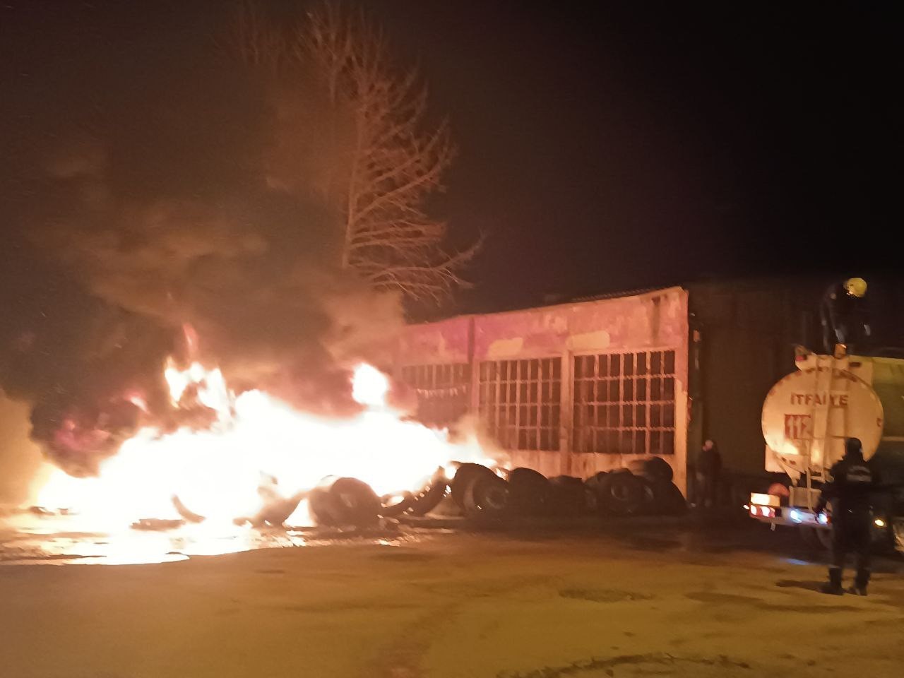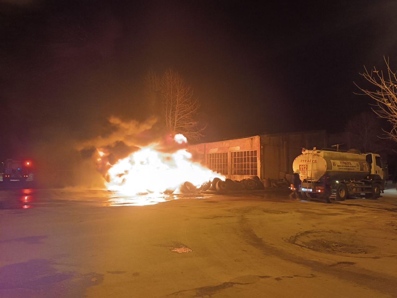 Kozan ilçesi Varsaklar Mahallesi’nde bulunan küçük sanayi sitesinde Recep Çelik’e ait lastik satış dükkanında henüz nedeni bilinmeyen bir şekilde yangın çıktı. İş yerinin önünde yanmaya başlaya lastikler kısa sürede tüm iş yerini sararken alevler adeta geceyi aydınlattı. İş yerinin yanında bulunan Fiat Doblo marka bir araç da alevlerin araca sıçraması ile küle döndü.