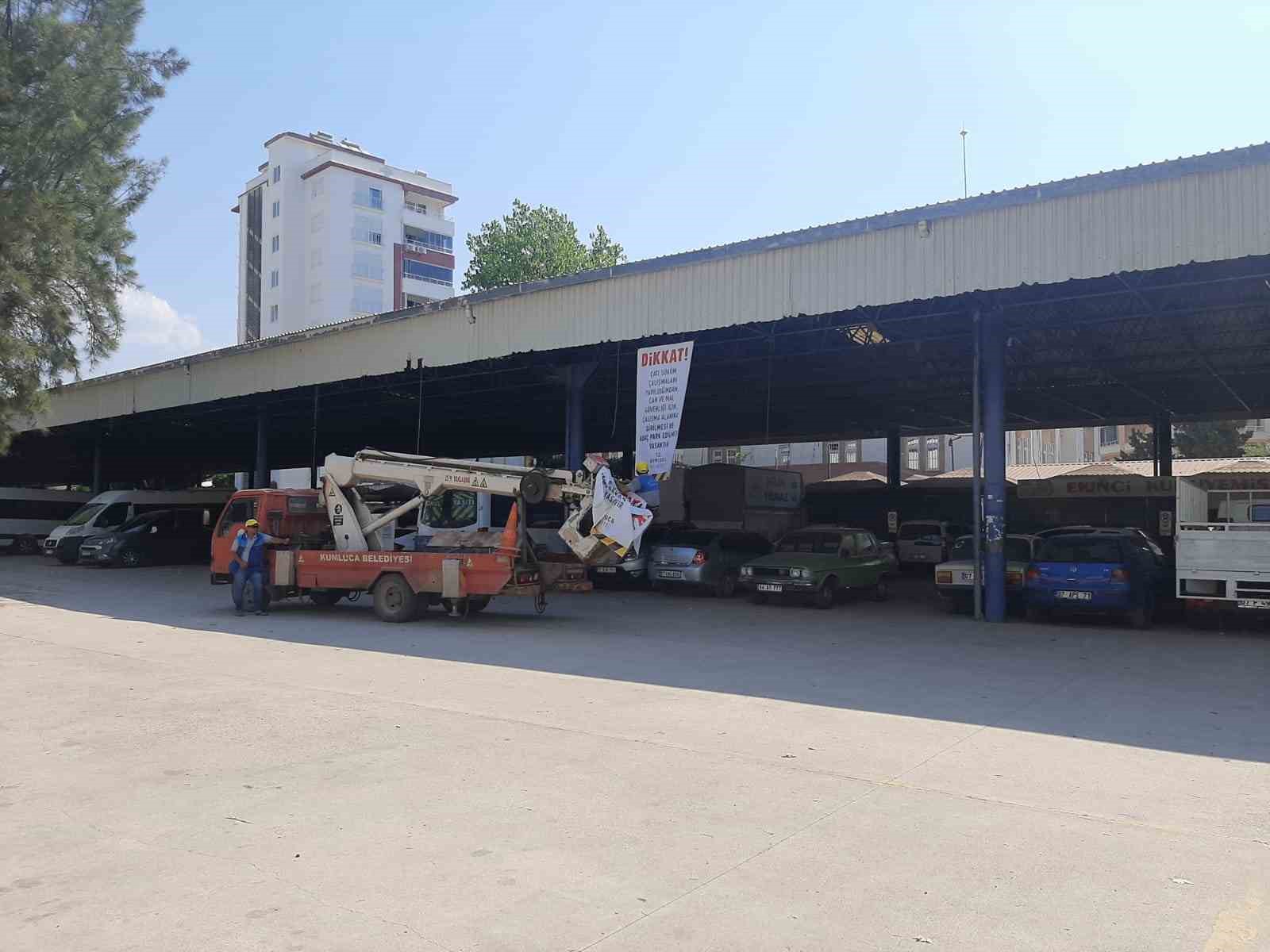 Eski Kapalı Halk Pazarı’na gelen belediye ekipleri tarafından önce “Dikkat çatı söküm çalışmaları yapıldığından can ve mal güvenliği için çalışma alanına girilmesi ve araç park edilmesi yasaktır” pankartları asıldı.