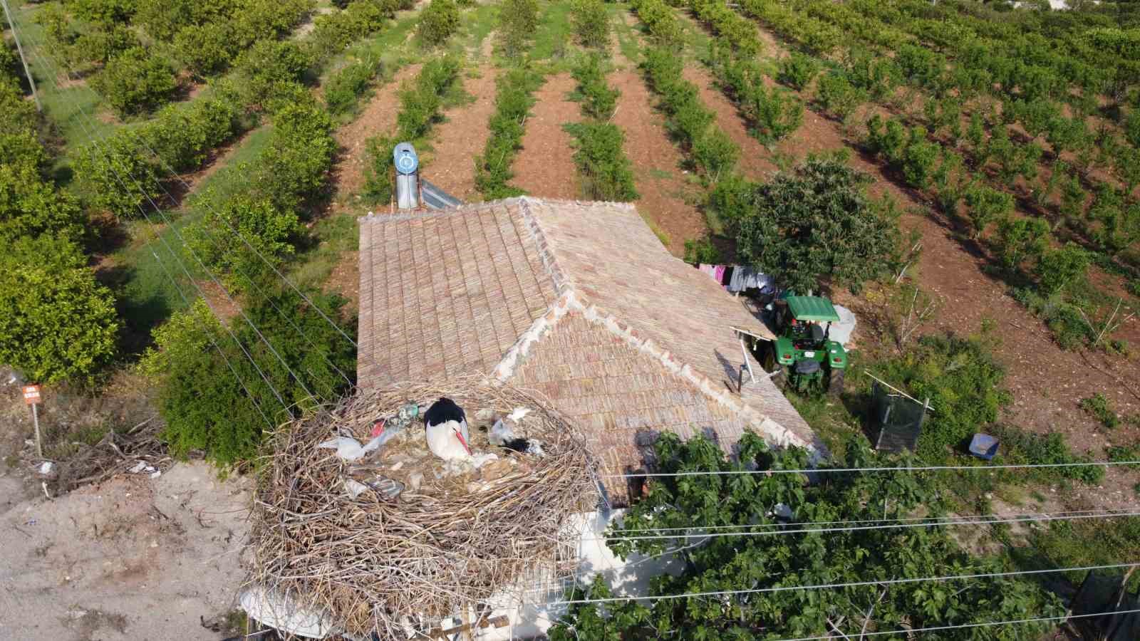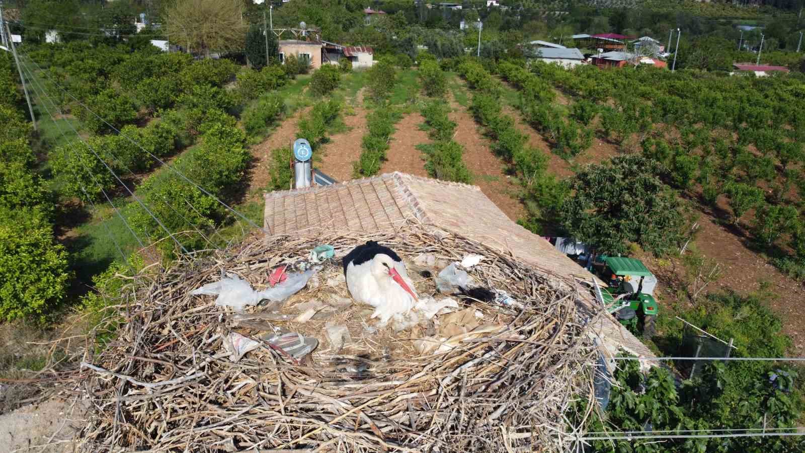 Adana’nın Kozan ilçesine 5 yıldır gelen leyleklerin, yuvaya taşıdığı çöpler dikkat çekti.