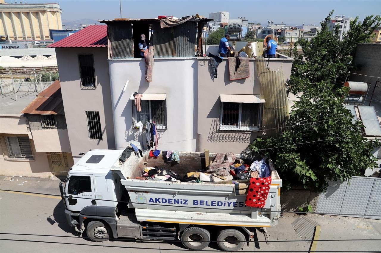 Akdeniz ilçesine bağlı Çilek Mahallesi’nde vatandaşların ’kötü koku ve görüntü kirliği’ yönündeki şikayet ve ihbarı üzerine harekete geçen Akdeniz Belediyesi Çevre Koruma ve Kontrol Müdürlüğü ile Zabıta Müdürlüğü ekipleri, 6331 Sokak’ta bulunan 2 katlı yapıda çöp, mobilya, karton, tekstil ve plastik atıkları istiflendiğini tespit etti. Özellikle evin damında biriktirilen çeşitli çöp ve atıklar, ekipler tarafından kamyonlara yüklenerek atık bertaraf tesisine taşındı.