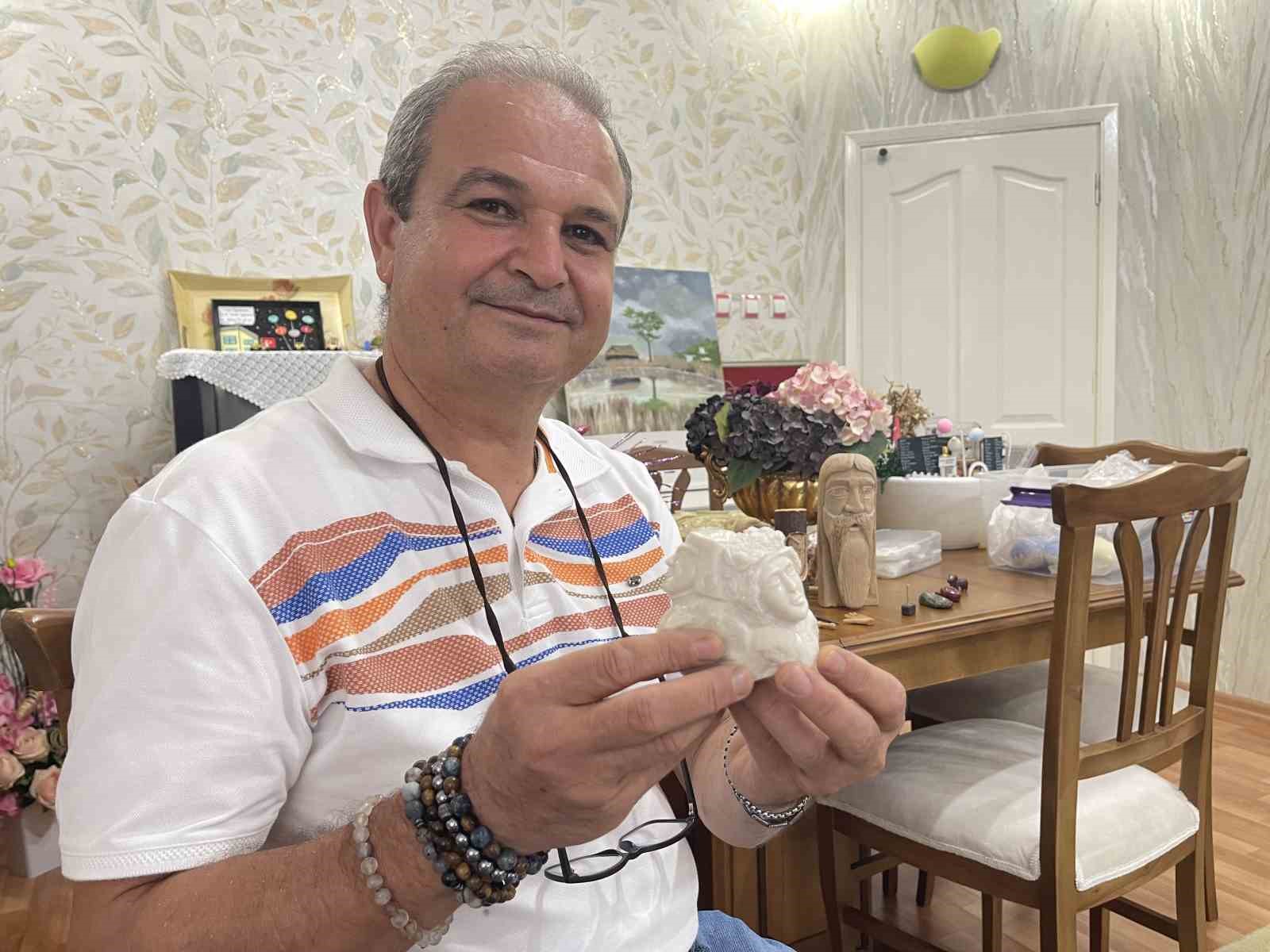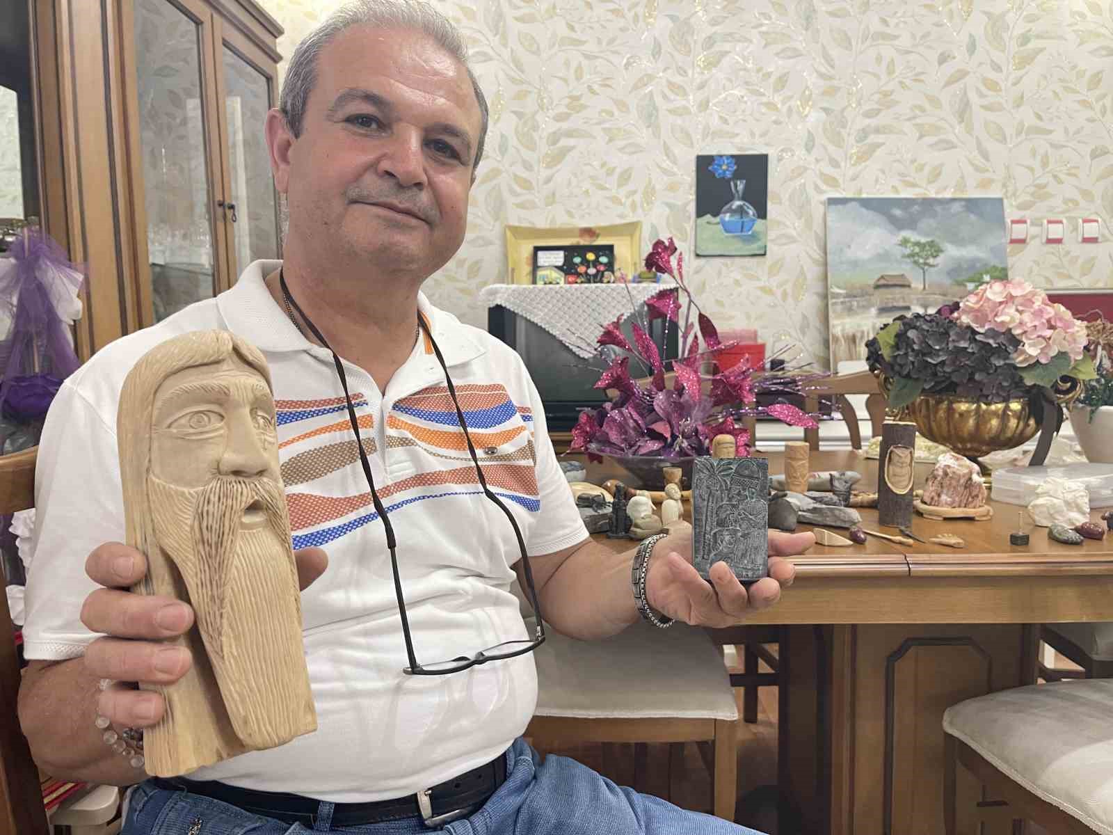 Osmaniye’de yaşayan 57 yaşındaki Fatih Güvercin, meyve bıçağıyla başladığı hobisinde atölyeye dönüştürdüğü evinin balkonunda kendi imkanları ile taş ve ahşabı sanata dönüştürüyor.
