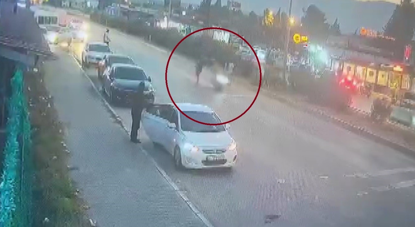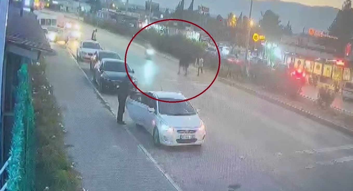 Hatay’ın Antakya ilçesinde yolun karşısına geçen 2 yayanın motosikletin çarpması ile havaya uçtuğu anlar güvenlik kamerasına yansıdı.