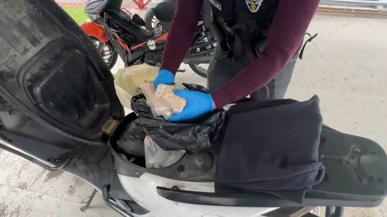 Motosikletin koltuğunun altında poşet içerisinde 5 bin 92 uyuşturucu hap ile 1.56 gram metamfetamin ele geçirildi. Gözaltına alınan şüpheli emniyete götürüldü.