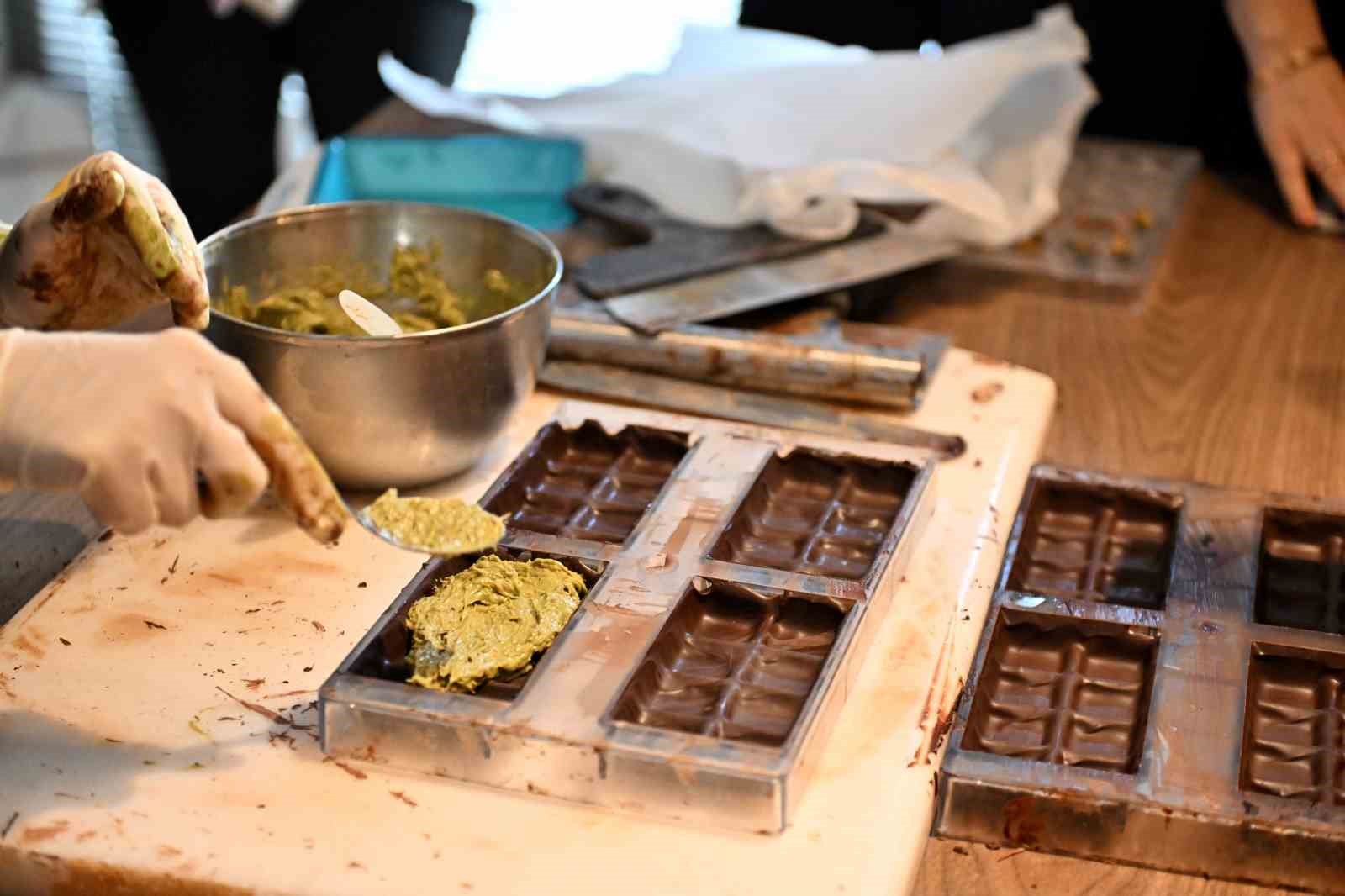 Ardından Dubai çikolatasının fıstık kremalı iç harcının hazırlığına geçildi. Harç içerisinde 600 gram Antep fıstığı kreması, 100 gram kavrulmuş kadayıf ve 25 gram tahin kullanıldı. Malzemelerin harmanlanmasının ardından harç, çikolatayla kaplanan kalıplara özenle sürüldü. Bu işlem tamamlandıktan hemen sonra ise çikolata, ısı derecelerine dikkat edilerek aynı işlemlerden geçirildi ve harcın üzeri çikolatayla kaplandı. Hazırlanan kalıplar buzdolabında soğumaya bırakıldı.