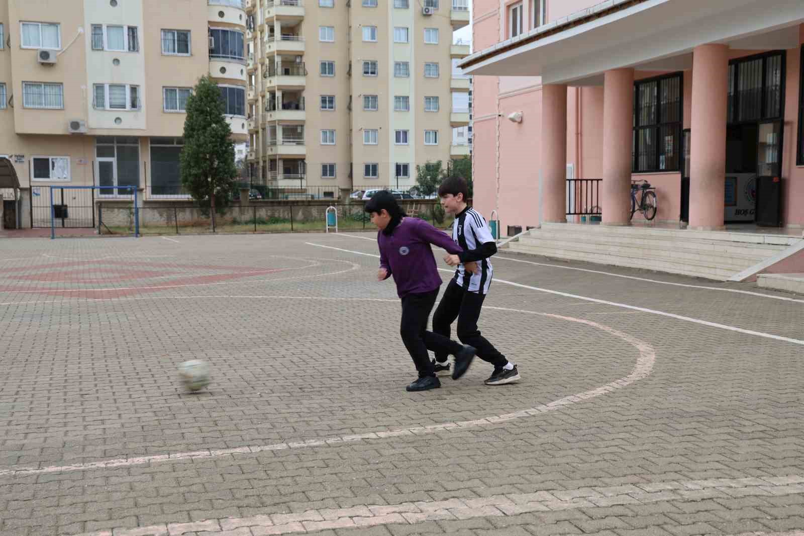 Adana’nın Kozan ilçesinde okul bahçesinde öğrencilerin futbol oyununa ortak olan köpek renkli görüntülere neden oldu.