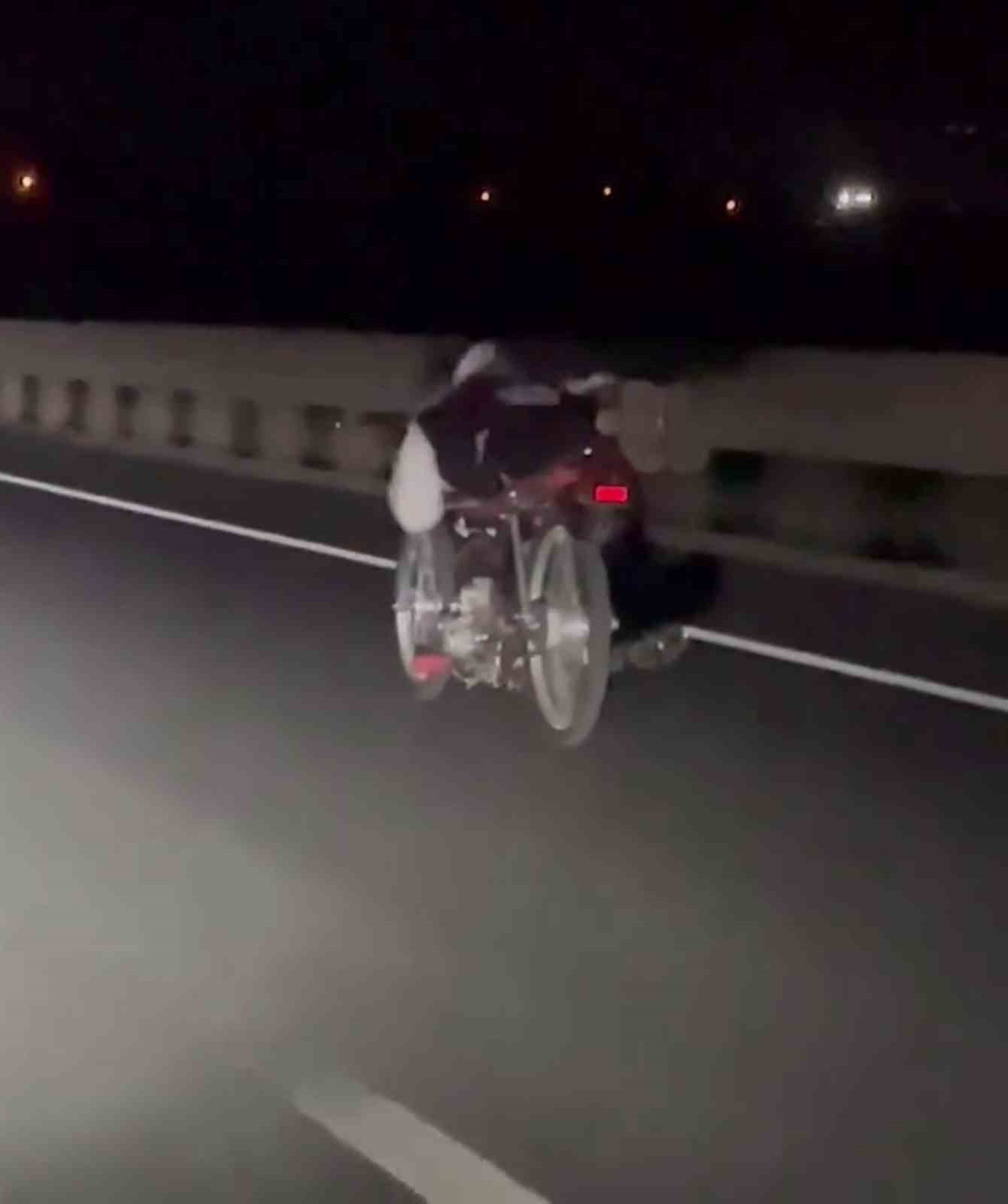 Hatay’da motosikletin üzerine yatarak ölüme meydan okuyan ve o anları sosyal medyada paylaşan şahsa ’trafiği tehlikeye sokmak’ suçundan adli işlem yapıldı, motosikleti otoparka çekildi ve ehliyetine el konuldu.