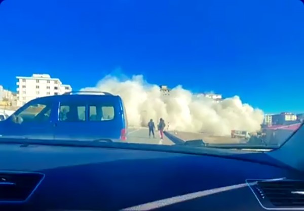 Kahramanmaraş’ta depremde ağır hasar alan binanın yıkımı sırasında operatörün binanın altında kalma anları saniye saniye görüntülendi. Operatörü kurtarma çalışması devam ediyor.
