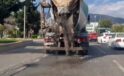Beton mikserinin harcı karayoluna dökerek ilerlediği anlar kamerada