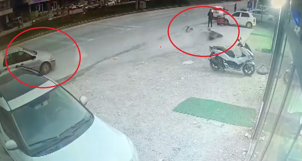 Hatay’da dönüş yapmak isteyen otomobille çarpışan motosiklet sürücüsünün kazayla birlikte savrularak metrelerce sürüklendiği anlar kameraya yansıdı.