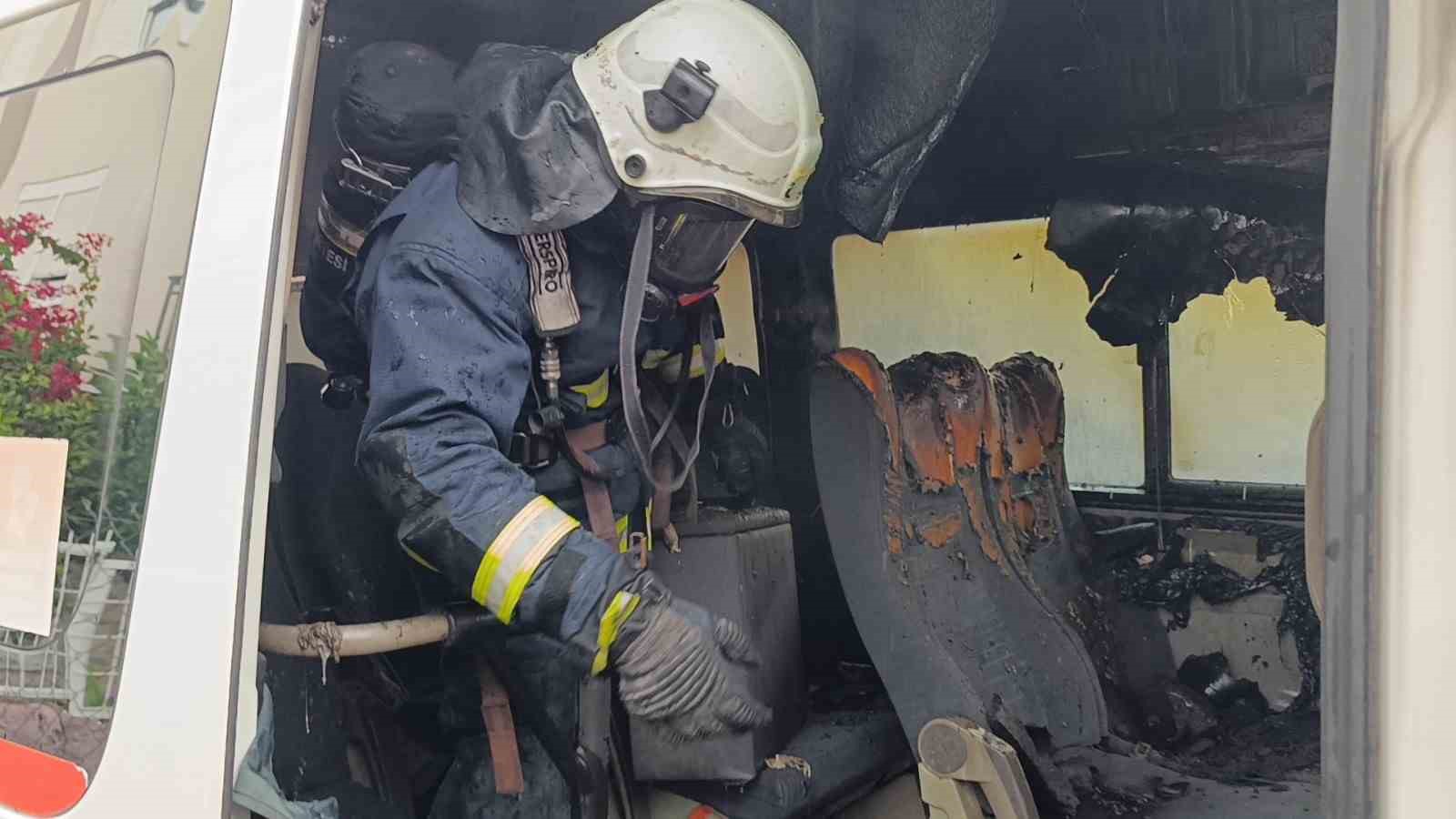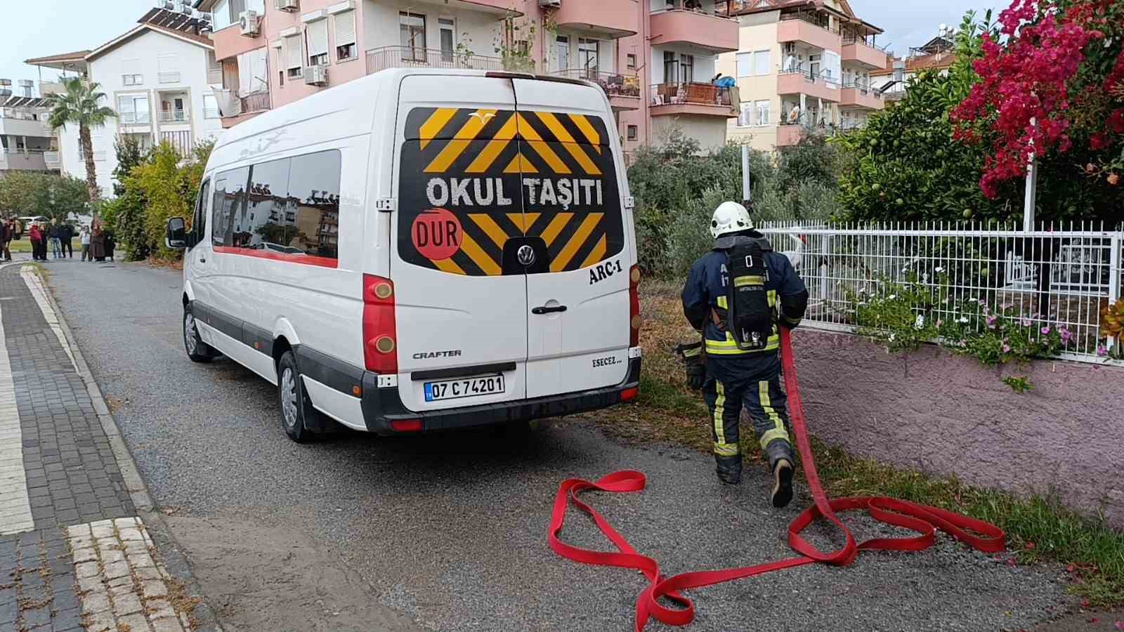 Olay, Antalya’nın Manavgat ilçesi Aşağı Pazarcı Mahallesi Aşık Veysel Caddesi 1071 sokak üzerinde meydana geldi. Edinilen bilgiye göre, sokak üzerinde park halindeki Adem Saban’a ait 07 C 74201 plakalı okul servisinin yandığı ihbarı Antalya Büyükşehir Belediyesi İtfaiyesi Manavgat Birimi ve Manavgat Emniyet Müdürlüğü ekiplerini alarma geçirdi. İhbarla olay yerine gelen itfaiye ekipleri aracın iç kısmının yandığını belirlerken, aracın kapısının açılmasıyla dumanlar çıkmaya başladı.
