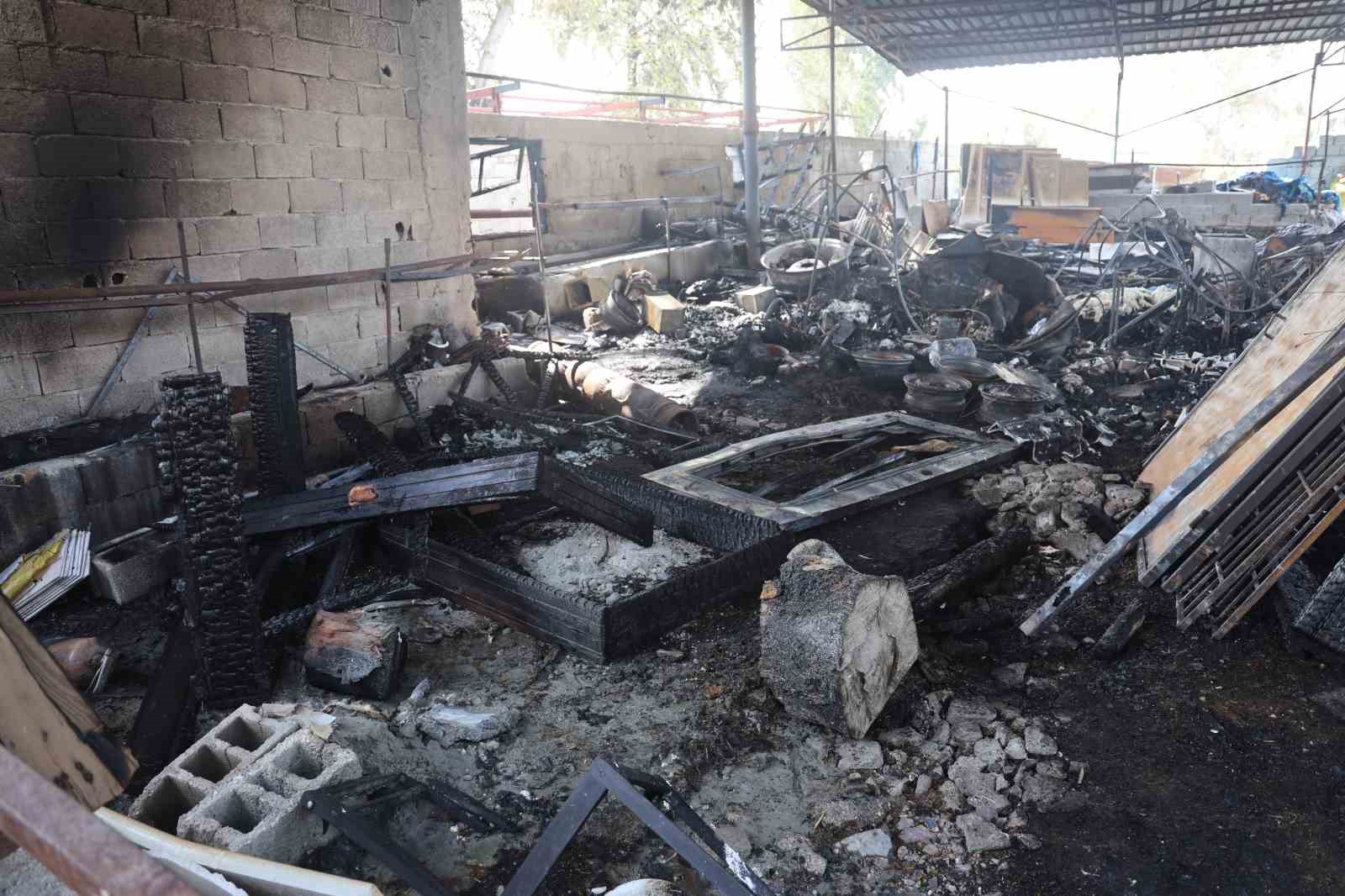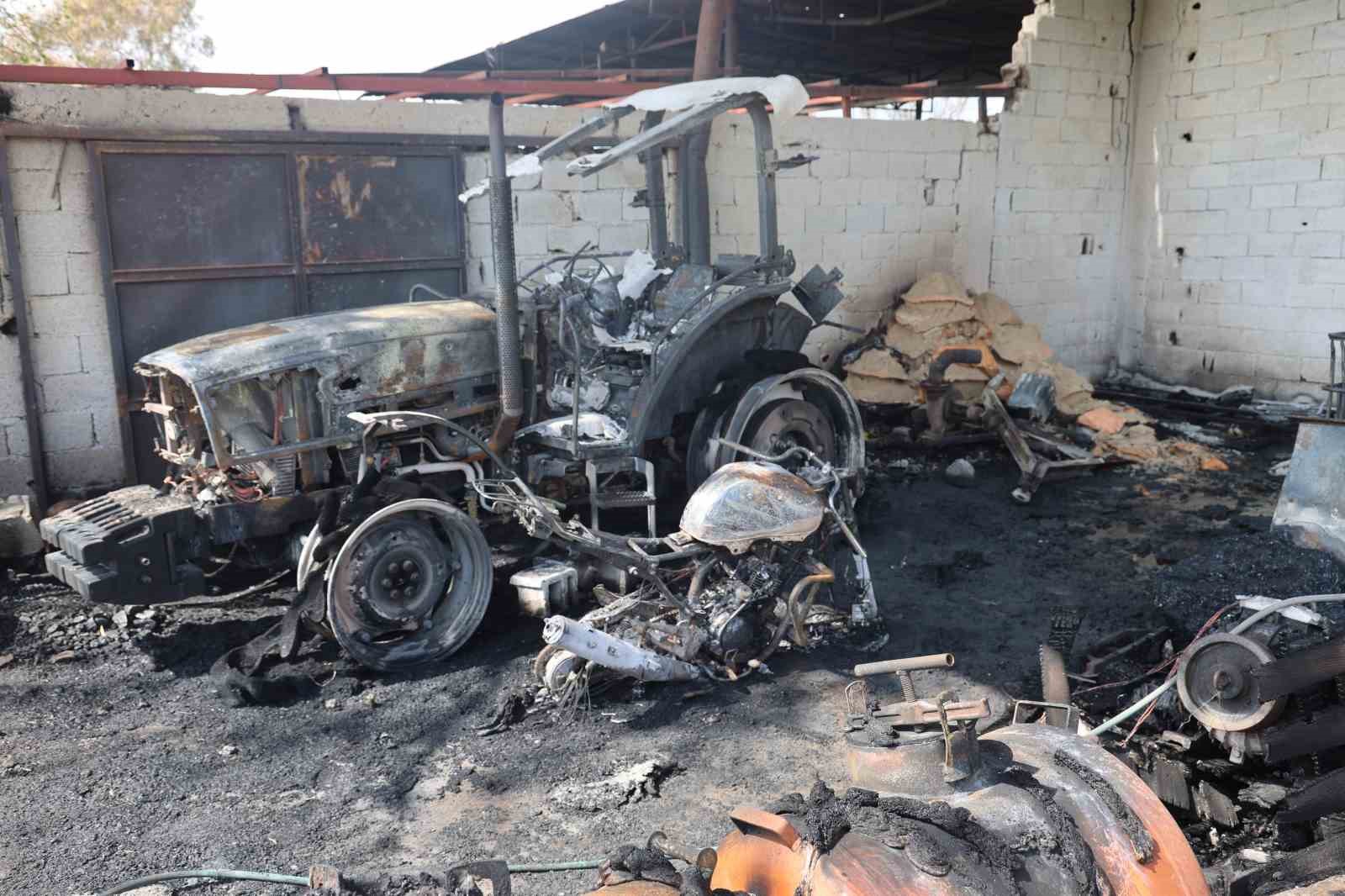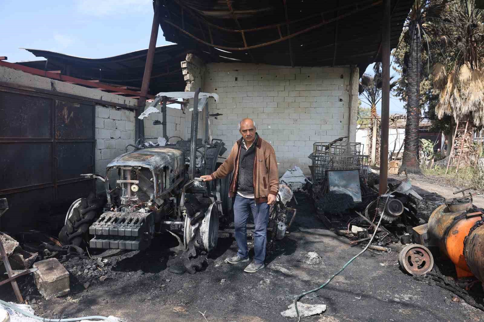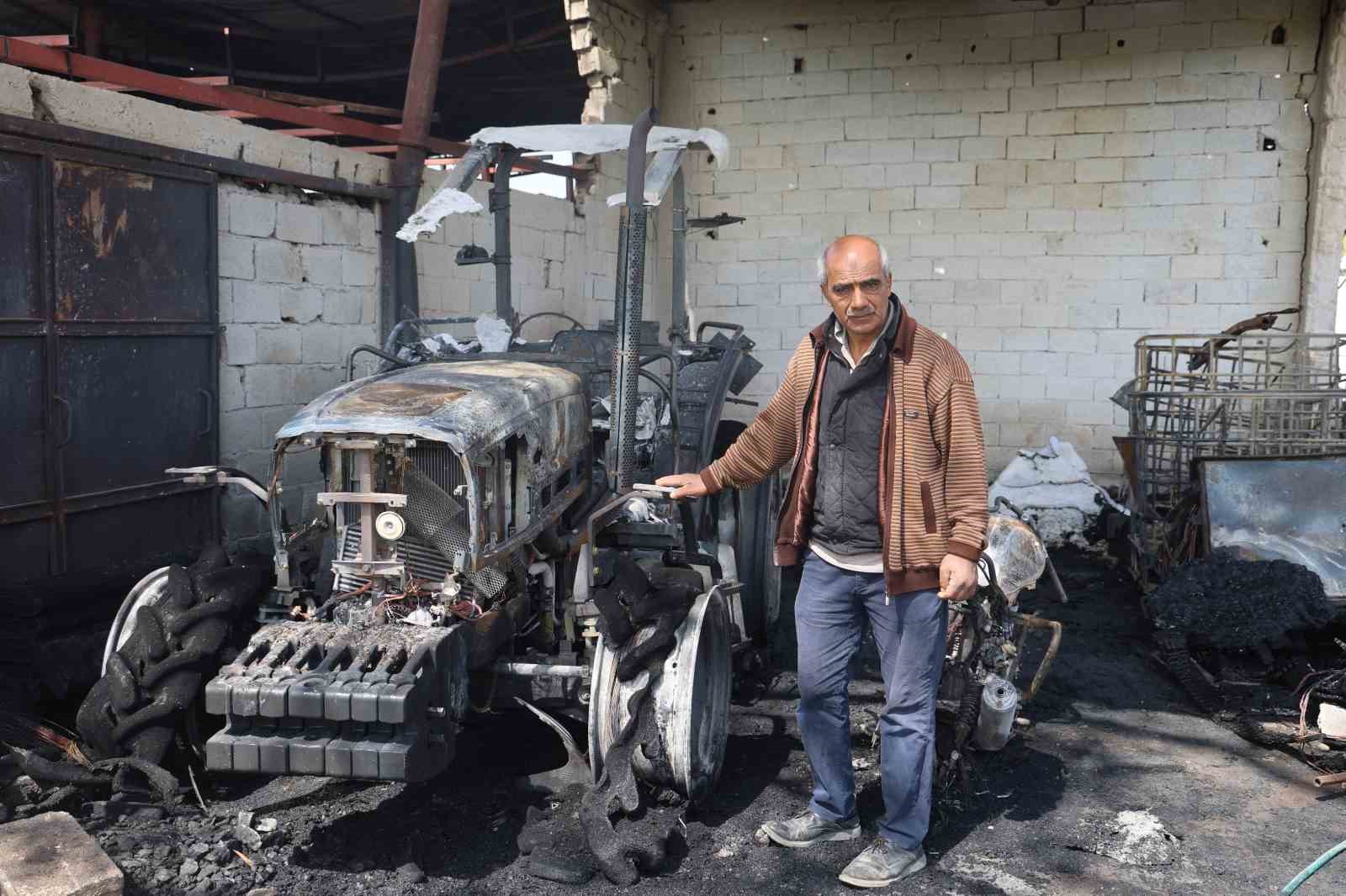 Hatay’da alevlere teslim olan garajdaki 1 traktör, 3 motosiklet ve tarım aletleri kullanılmaz hale geldi. Yangın anında yaşananları anlatan Galip Güney, traktörün tekerinin patlamasıyla yangını fark ettiklerini söyledi.