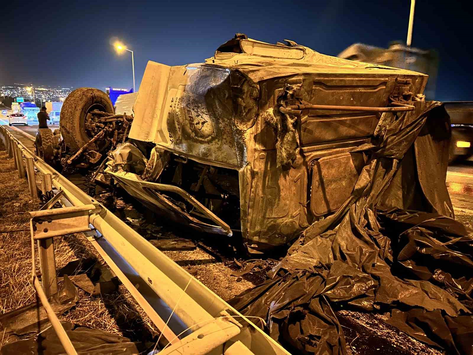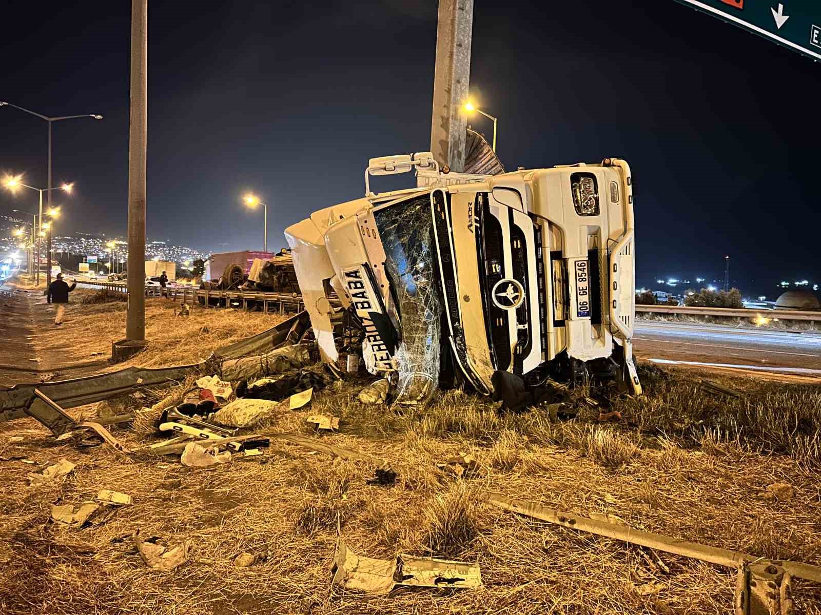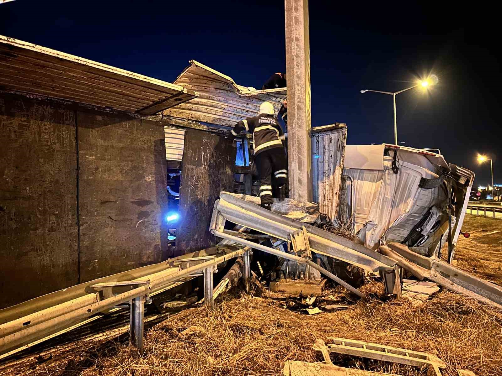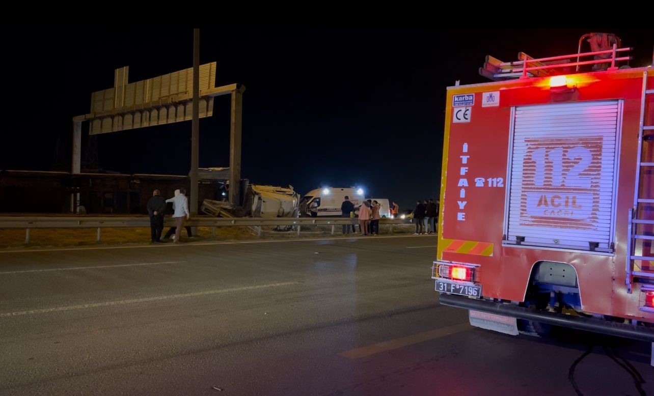 Hatay’da kontrolden çıkarak orta refüje çarpan ve devrilen tırdaki 2 araç yola savruldu, tır sürücüsü yaralandı.