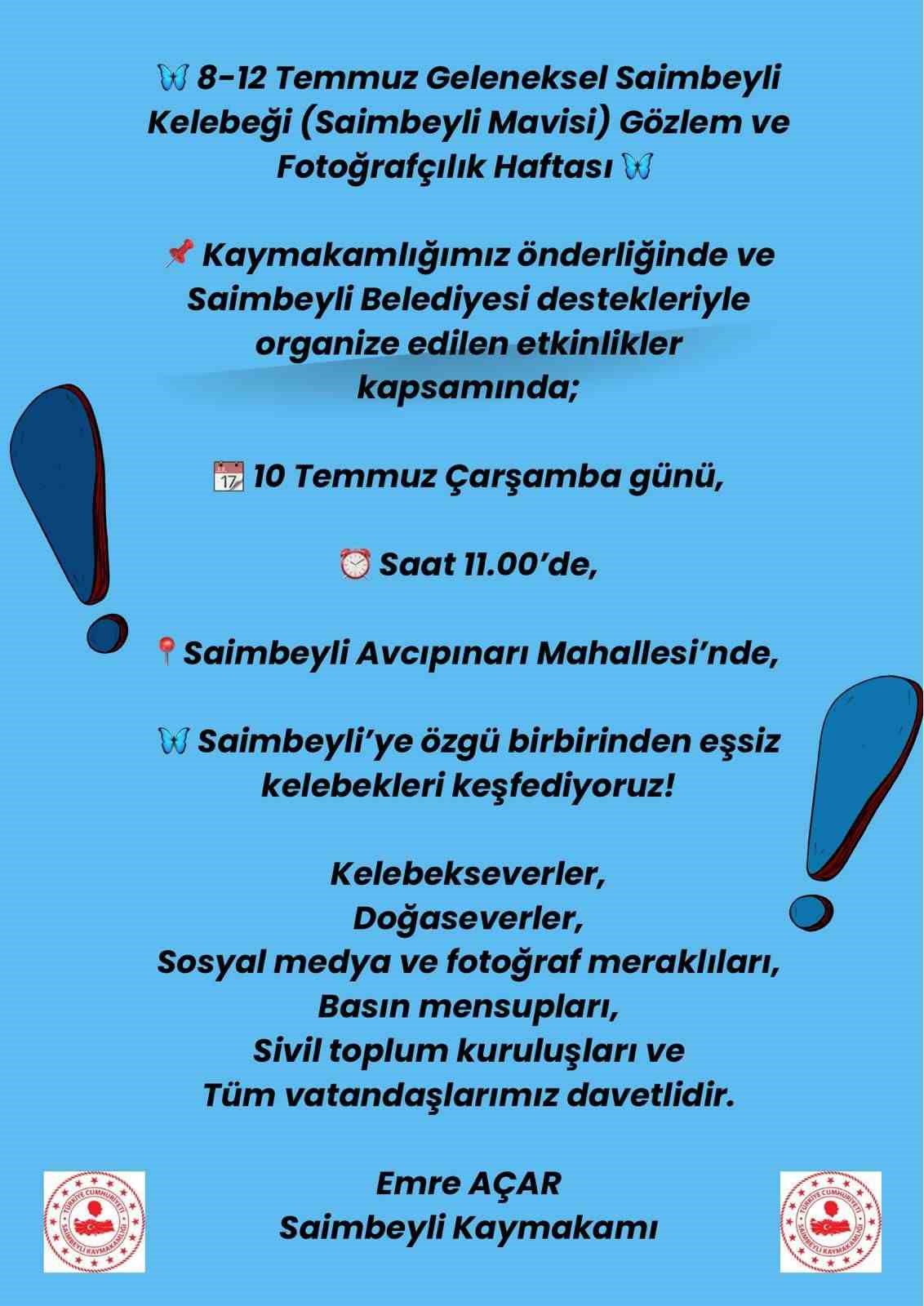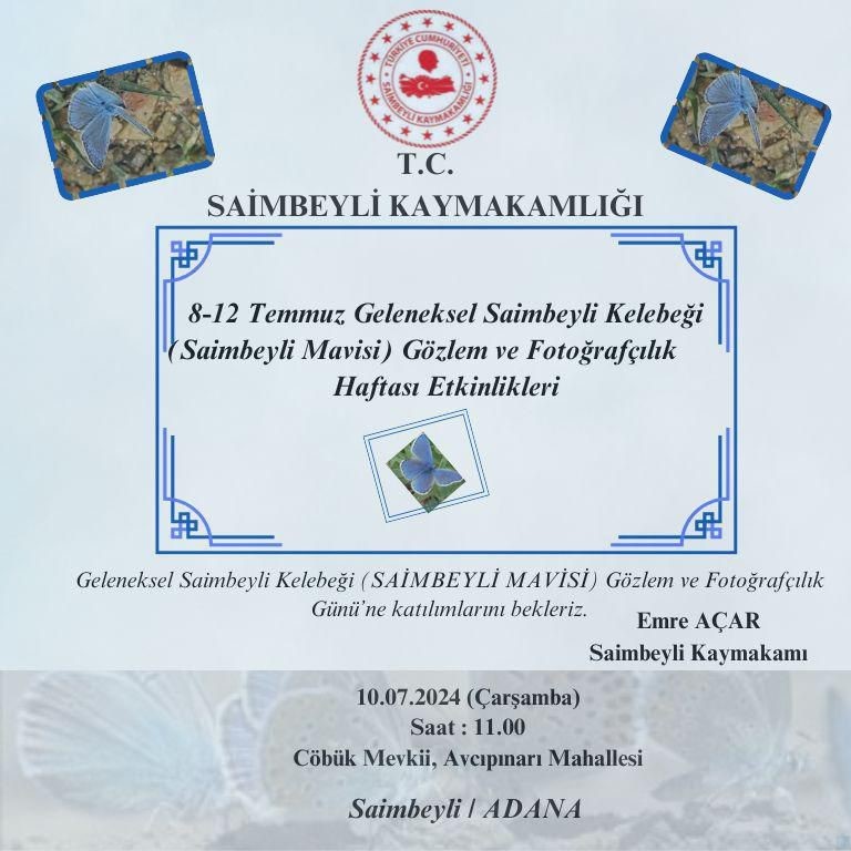 Saimbeyli Kaymakamlığı tarafından 8-12 Temmuz tarihleri arasında Geleneksel Saimbeyli Kelebeği (Saimbeyli Mavisi) Gözlem ve Fotoğrafçılık Etkinliği düzenlenecek.