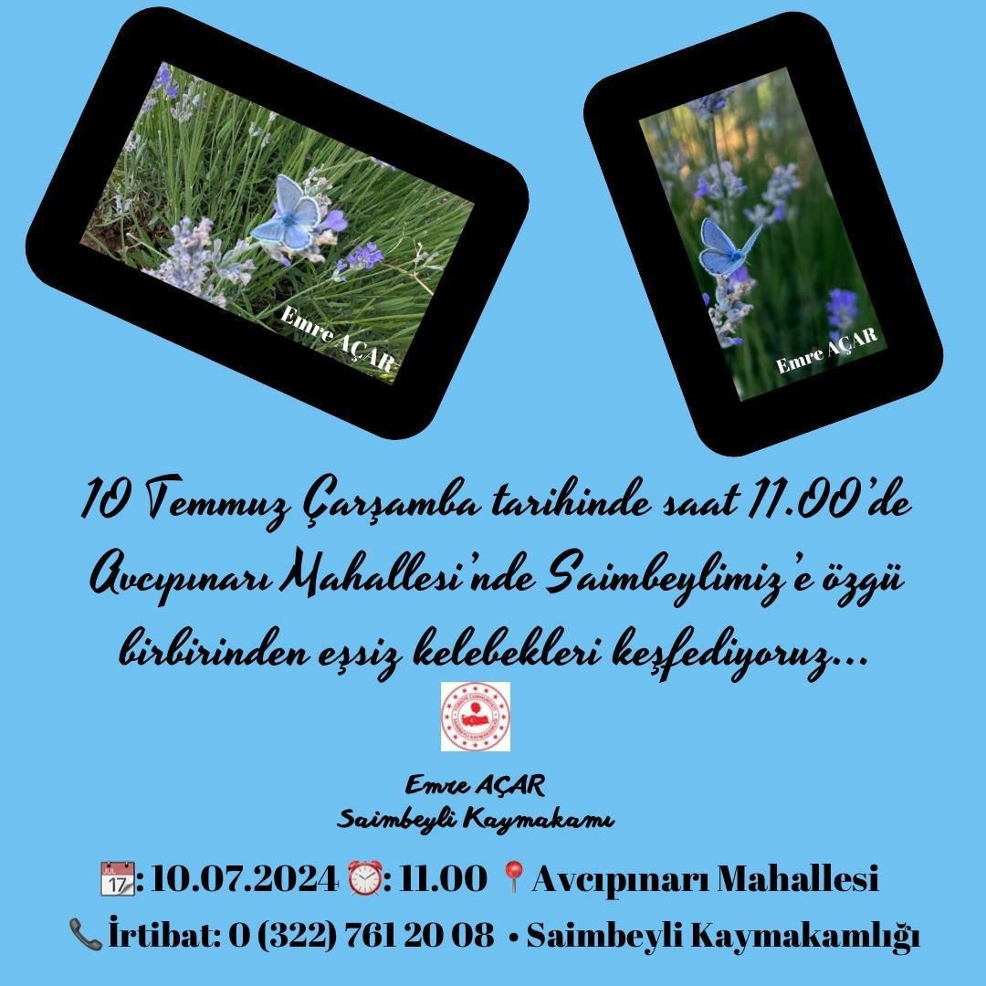 Etkinlik öncesi açıklama yapan Kaymakam Açar, “Kaymakamlığımız önderliğinde ve Saimbeyli Belediyesinin destekleriyle önemli bir etkinlik organize ettik. 10 Temmuz Çarşamba günü saat 11.00’de Avcıpınar Mahallesi’nde, Saimbeyli’ye özgü birbirinden eşsiz kelebekleri keşfedeceğiz. Kelebek severleri, doğaseverleri, sosyal medya ve fotoğraf meraklıları, basın mensupları, sivil toplum kuruluşları ve tüm vatandaşlarımız davetlidir” diye konuştu.