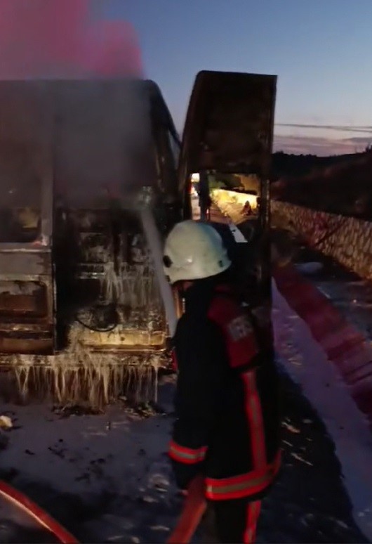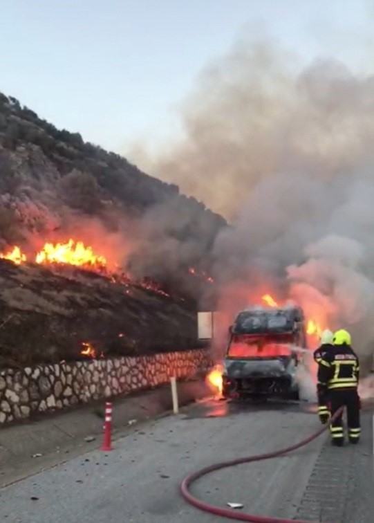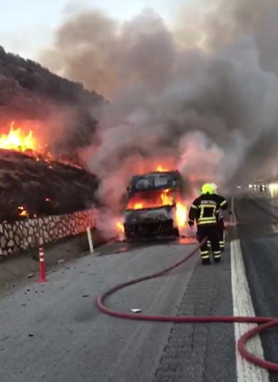Servis aracı otoyolda yandı, yangın çalılara sıçradı