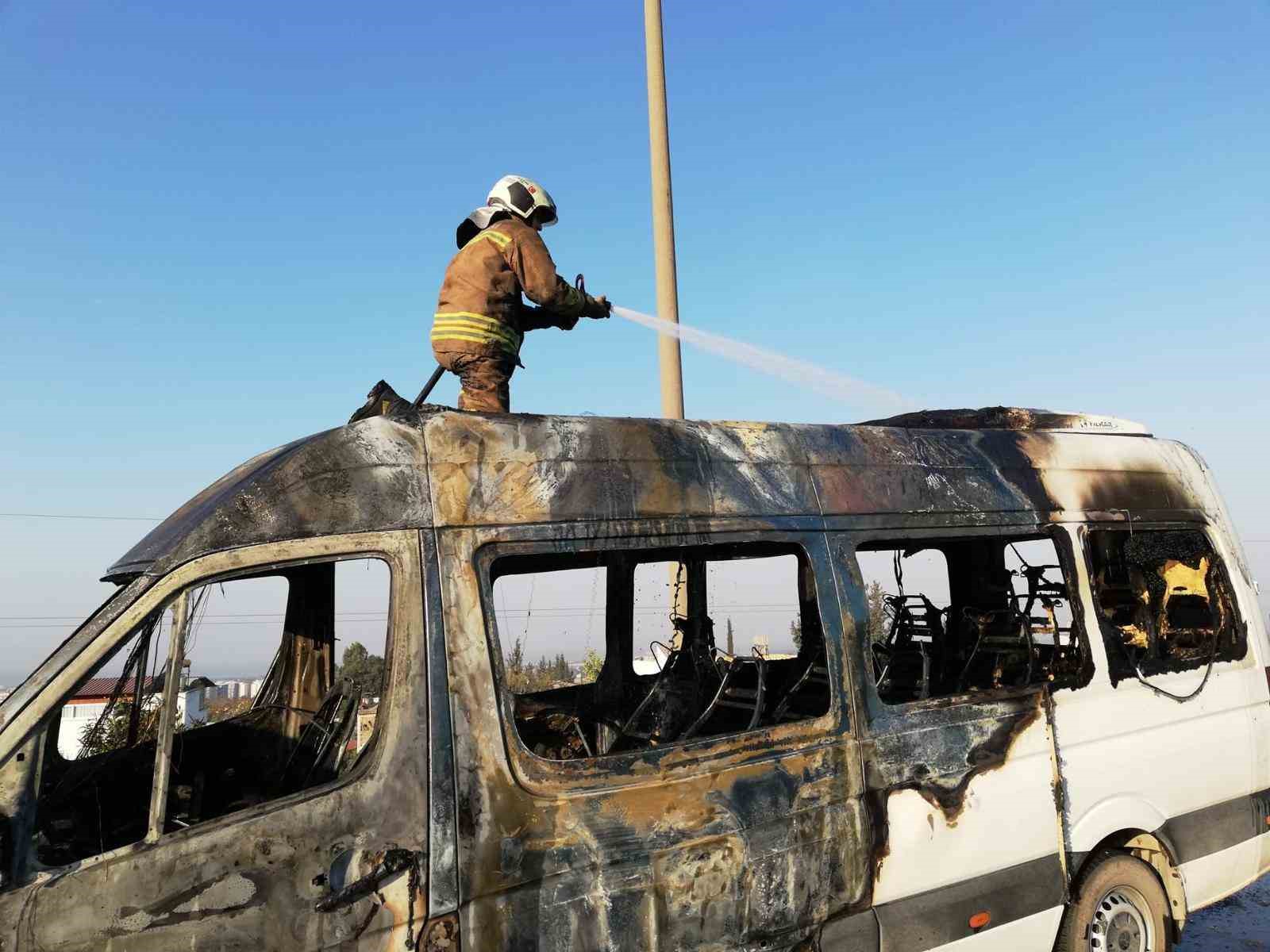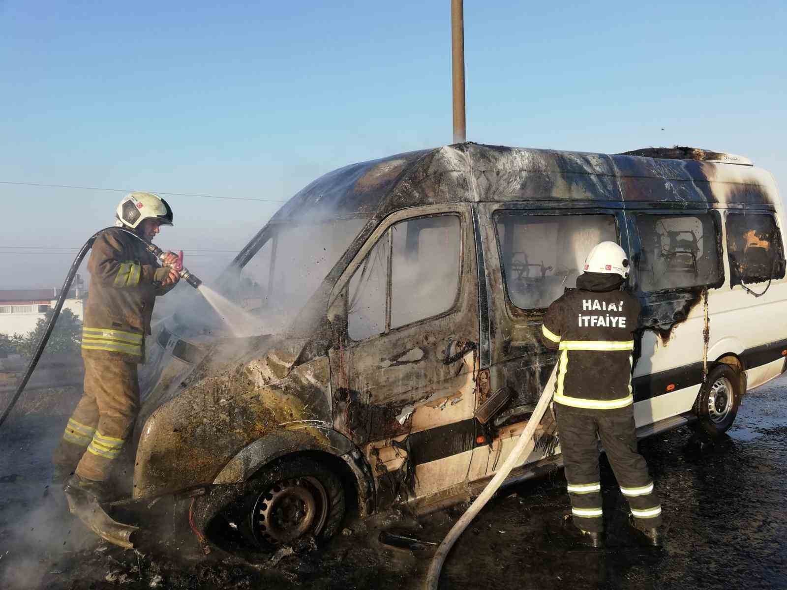 Hatay’da seyir halindeyken motor kısmı yanmaya başlayan minibüs alev alev yandı.