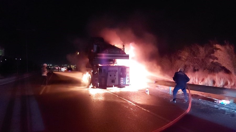 Hatay’da seyir halindeki vinç alevlere teslim olarak yandı.