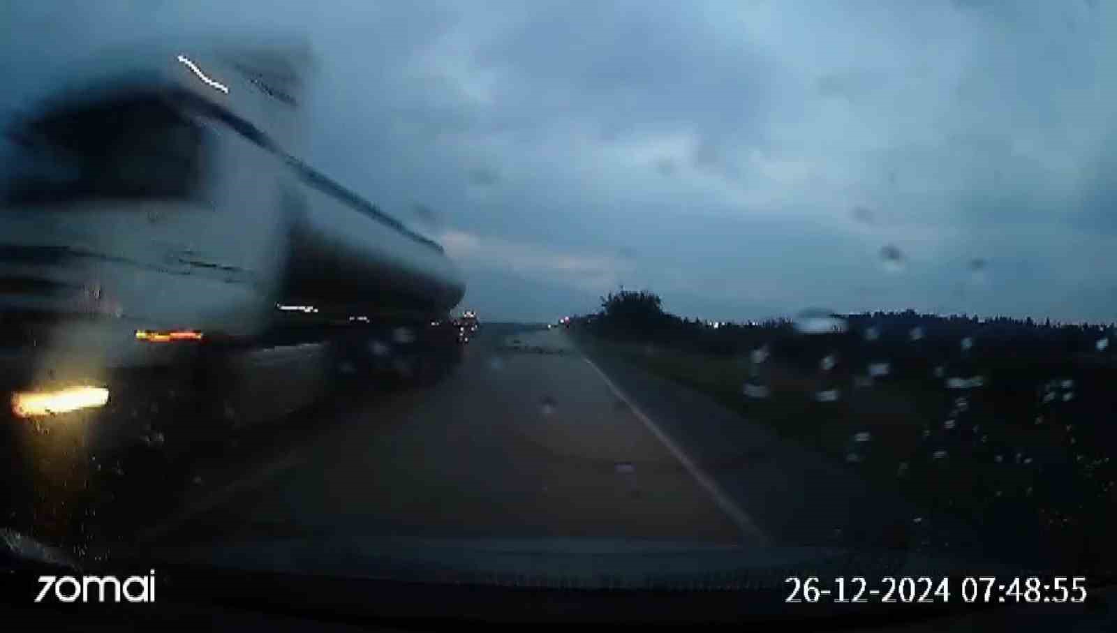 Hatay’da yağışlı havanın etkisiyle sürücüsünün direksiyon hakimiyetini kaybettiği tanker karşı şeride geçti, korku dolu anlar araç kamerasına yansıdı.