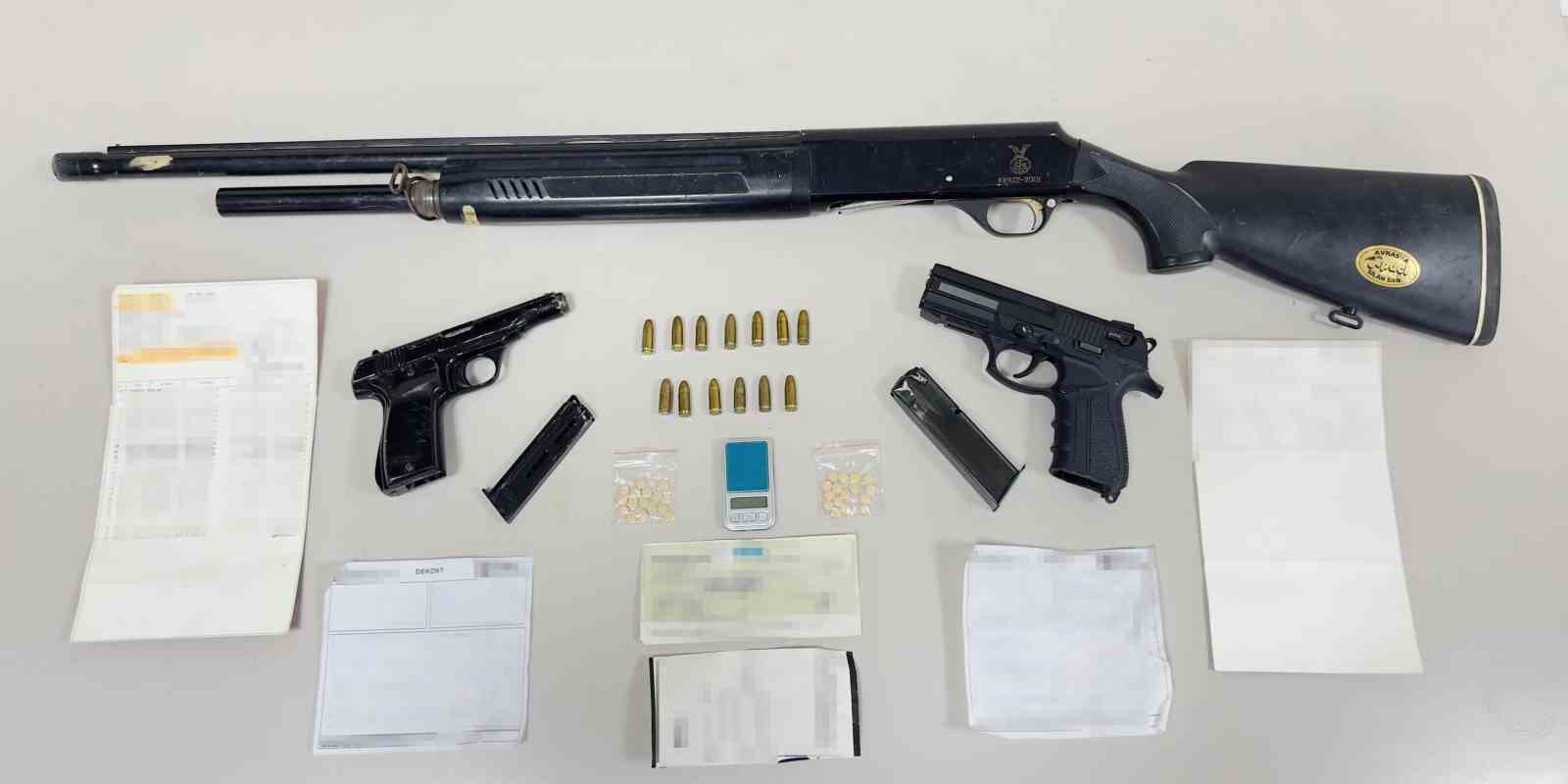 Polis söz konusu işyerine operasyon düzenlendi. İşyerinde yapılan arama çalışmalarında, 2 ruhsatsız tabanca, 1 ruhsatsız tüfek, hassas terazi, çek, banka cüzdanı, banka dekontu ve 32 uyuşturucu hap ele geçirildi.
