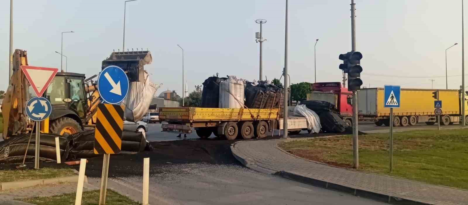 Mersin’in Tarsus ilçesinde plastik kasa hammaddesi olan polietilendir yüklü tırın taşıdığı yük yola savruldu.