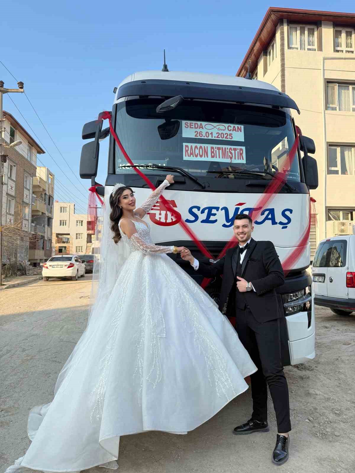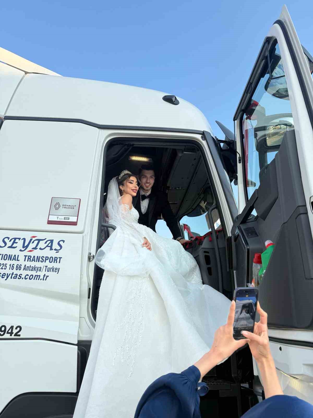 Hatay’da yaşayan tır şoförü Mehmet Can Kör, kullandığı tırı düğününde gelin arabası yaptı. Renkli görüntülerin oluştuğu düğünün ardından 2 yıllık tır şoförü damat, mesleğini bırakarak eşiyle birlikte esnaflık yapmaya başladı.