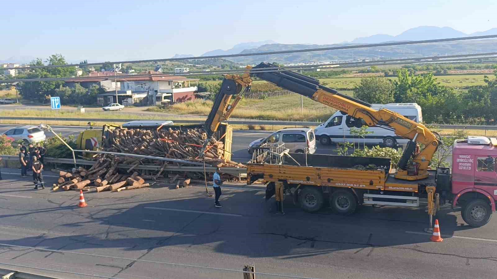 Antalya’nın Manavgat ilçesinde tomruk yüklü kamyonun bariyerleri aşıp refüje devrilmesi sonucu meydana gelen kazada şans eseri yaralanan olmadı.
