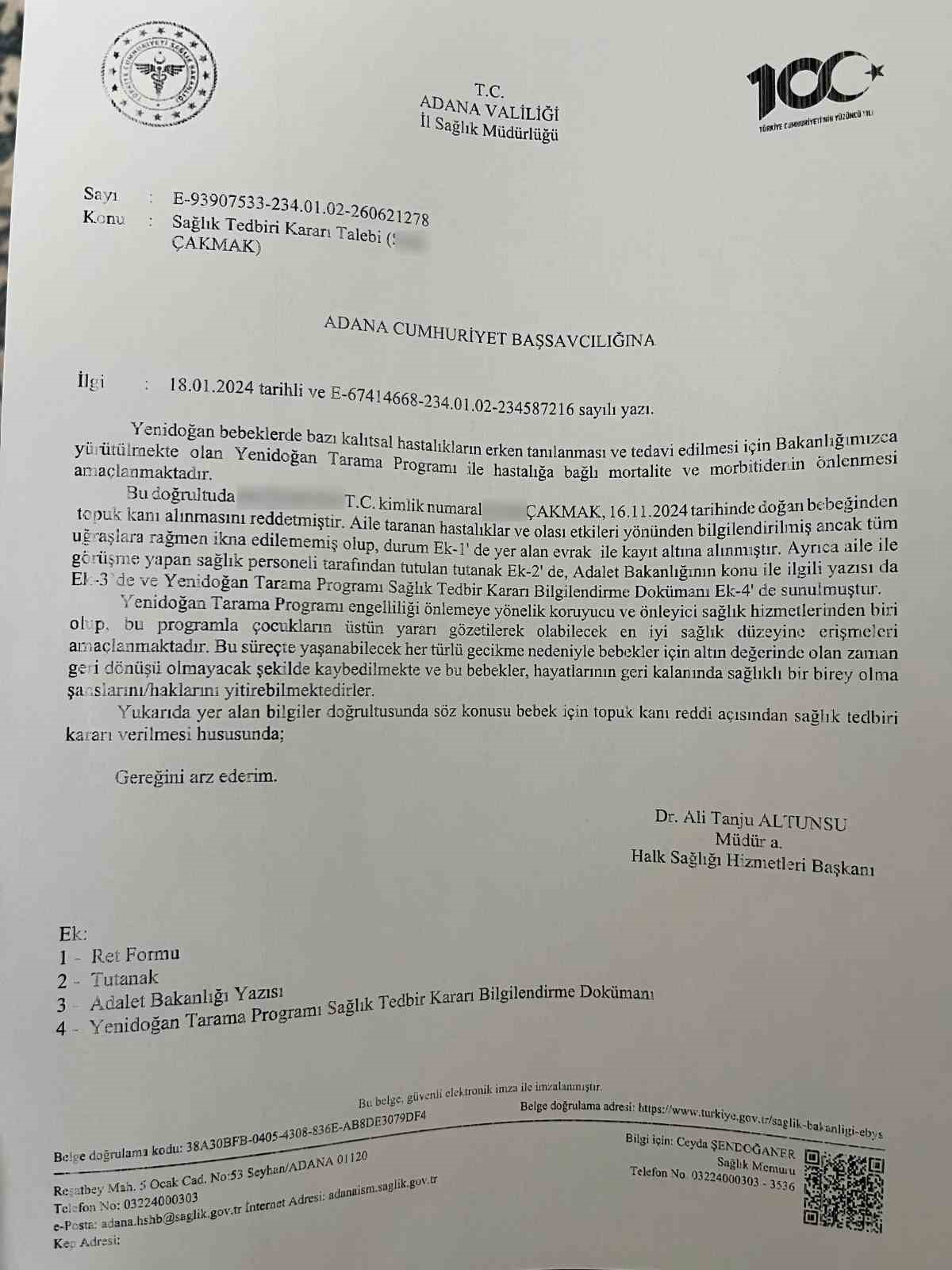Ancak topuk kanı alınmayıp aşı yapılmadığı için özel hastane durumu çiftin ikamet ettiği mahallenin sağlık ocağına, onlarda Sağlık Bakanlığı’na bildirdi. Topuk kanı aldırmayan aile hakkında Sağlık Bakanlığı şikayetçi oldu ve Adana 6. Sulh Hukuk Mahkemesi’nde dava açıldı. Açılan davada mahkeme, ailenin ifadesine başvurdu. 2.5 aylık M.T. için kayyum atanmasına karar verdi. Aile, mahkeme sürecinde Murat Çakmak’ın kardeşi F.Ç.’yi evlatlarının vasisi olarak mahkemeye bildirdi.