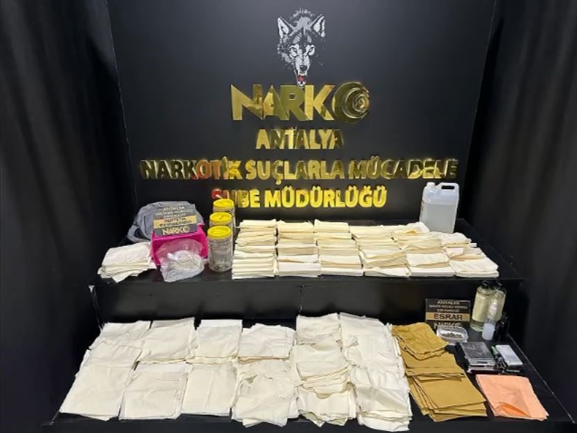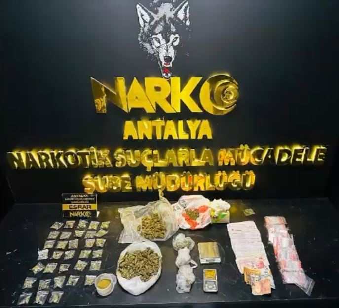 Antalya Cumhuriyet Başsavcılığı koordinesinde gerçekleşen operasyonda şüpheli şahıslar buluşma anında suçüstü yakalandı. Yakalanan şahısların ikametlerinin de aralarında bulunduğu Muratpaşa, Konyaaltı, Kepez ve Alanya ilçelerinde 4 ayrı adreste yapılan operasyonda, 575 adet sentetik kannabinoid A4 maddesi (yaklaşık 3 milyon 676 bin kullanımlık), 30 bin ecstasy hap, 778 gram kokain, 738 gram fubinica, 629 gram esrar, 238 sentetik ecza hap, 5 hassas terazi, 2 tabanca, 10 adet dolu fişek, suçtan elde edildiği değerlendirilen döviz ve Türk lirası ele geçirildi.