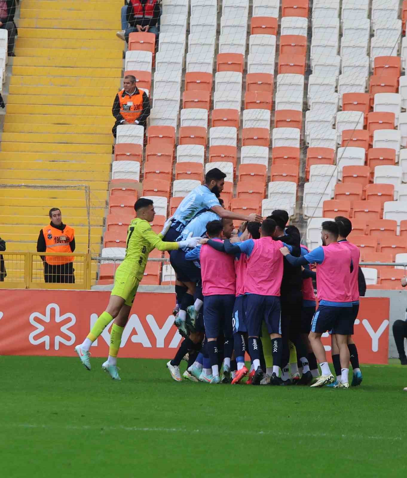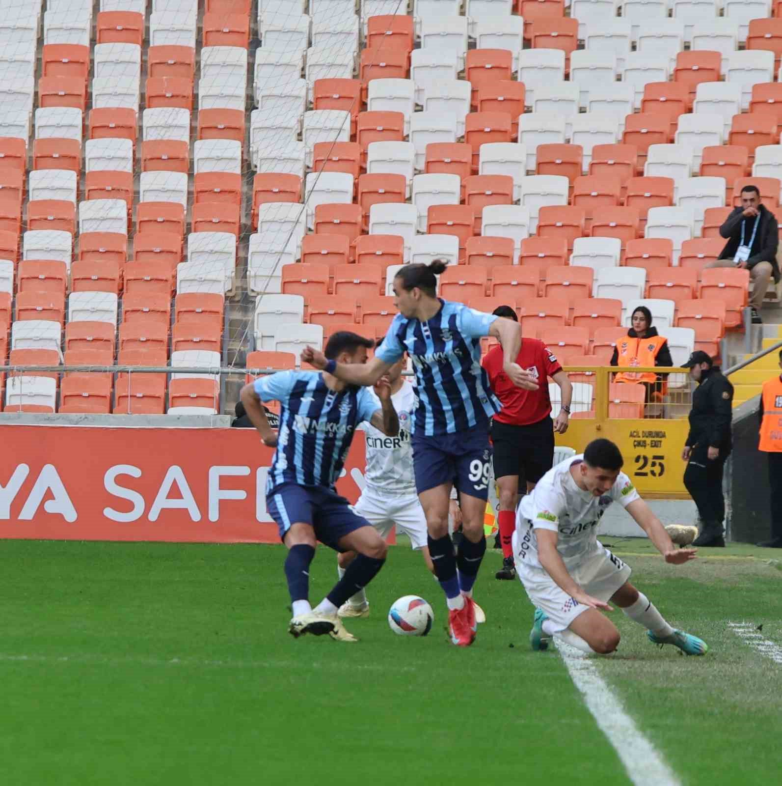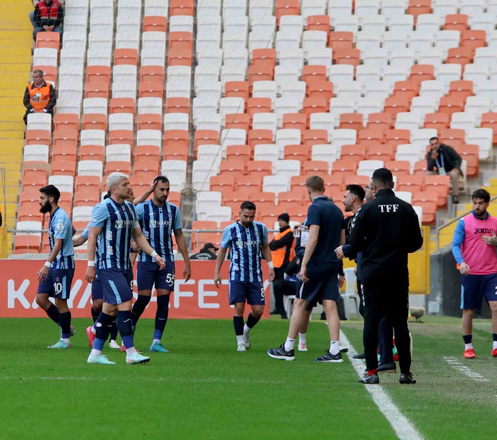 13. dakikada Adana Demirspor’un sol kanattan paslaşarak kullandığı serbest vuruşta Aliou topu ceza sahasına ortaladı. Penaltı noktası civarında yükselen Tolga Kalender’in kafa vuruşunda meşin yuvarlak ağlarla buluştu. 1-0
