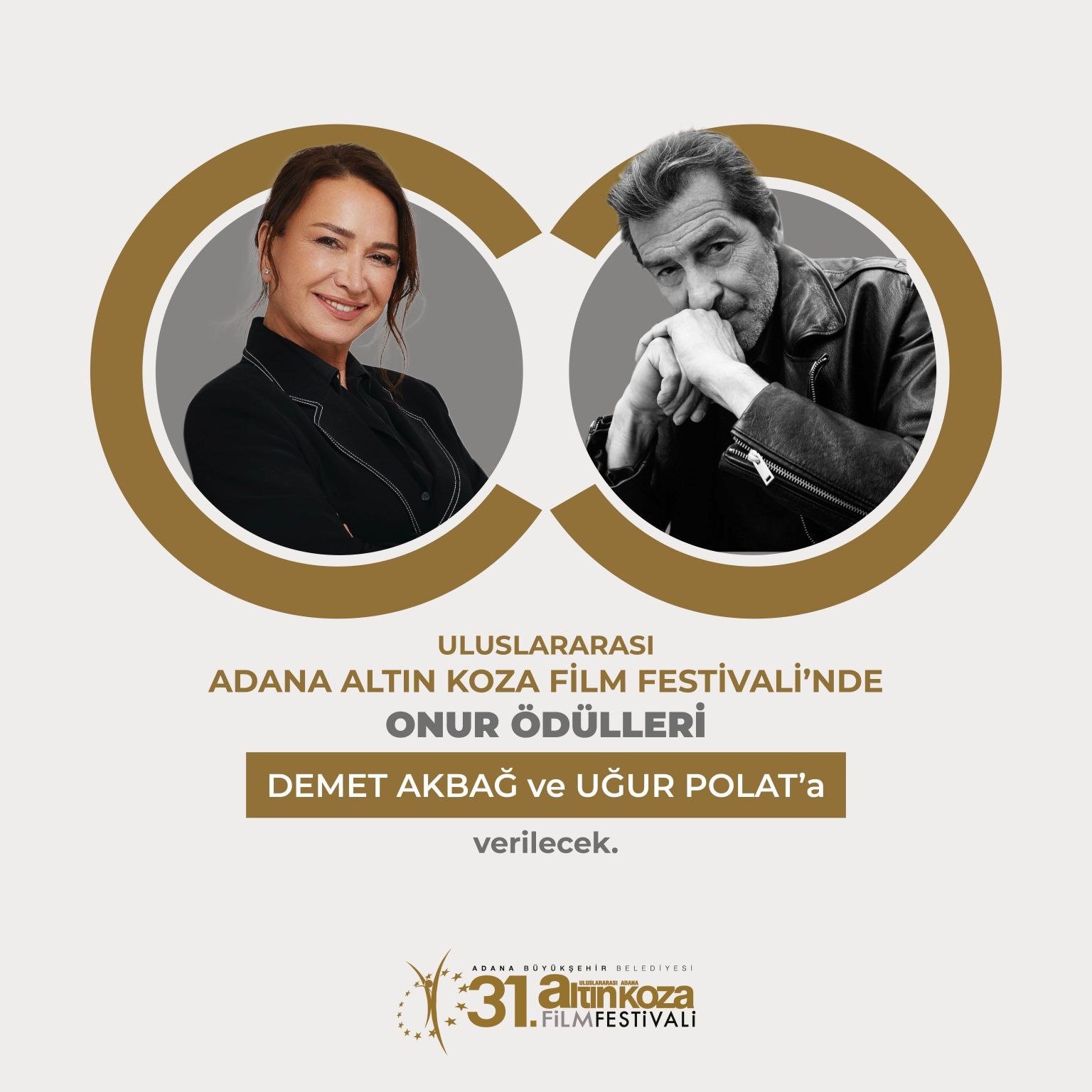 Festivali’nin Onur Ödüllerinin ise festival yürütme kurulunun kararıyla bu yıl; “Neredesin Firuze”, “Organize İşler”, “Vizontele”, “Eyyvah Eyvah”, “O Çocukları”, “Kurtuluş Son Durak”, “Hükümet Kadın”, “Kış Uykusu” filmleriyle tanıdığımız, 40 yılı aşkın süren oyunculuk kariyerinde sinemamızın unutulmaz güçlü kadın karakterlerine incelikle hayat vermiş oyuncu Demet Akbağ’a ve 1988’de “Sis” ile başlayan sinema kariyerinde “Suyun Öte Yanı”, “Cazibe Hanımın Gündüz Düşleri”, “Karşılaşma”, “Salkım Hanımın Taneleri”, “Filler ve Çimen”, “Sis ve Gece”, “Devrim Arabaları” ve “Anadolu Leoparı”nın da aralarında olduğu klasikleşmiş birçok filmdeki tutkulu ve cesur oyunculuğuyla hafızalarımıza kazınmış usta aktör Uğur Polat’a verilecek. 31. Uluslararası Adana Altın Koza Film Festivali’nin Onur Ödülleri, 26 Eylül Perşembe akşamı düzenlenecek özel bir gecede Demet Akbağ ve Uğur Polat’a sunulacak.