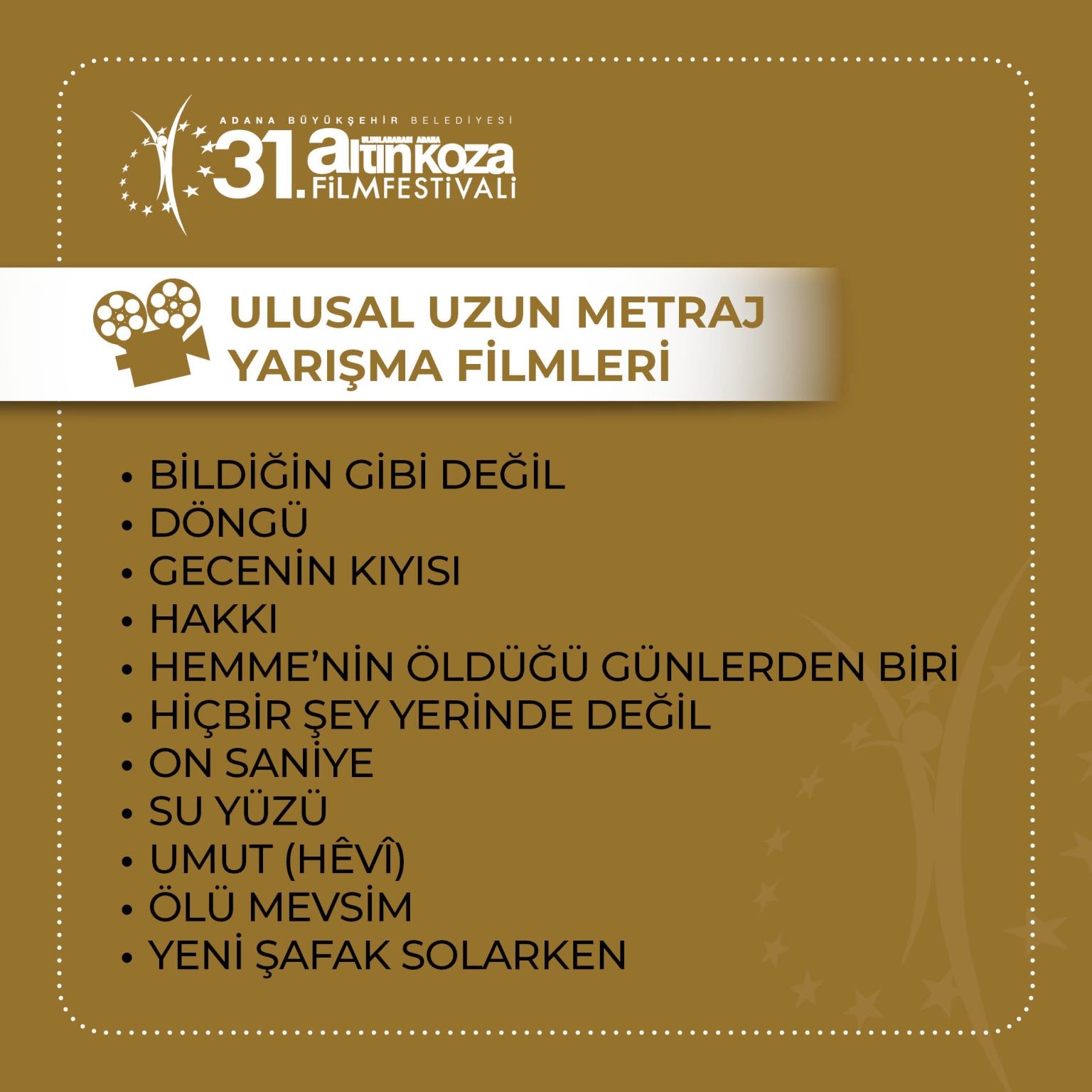 “Döngü”, “On Saniye”, “Ölü Mevsim”, “Su Yüzü” ve “Umut” (Hêvî) dünya prömiyerlerini Adana Altın Koza Film Festivali’nde yaparken, finalistlerden ayrıca, “Gecenin Kıyısı”, “Ölü Mevsim”, “Su Yüzü” ve “Umut” (Hêvî) da yönetmenlerin ilk uzun filmleri olarak festivalde seyirciyle buluşacak.