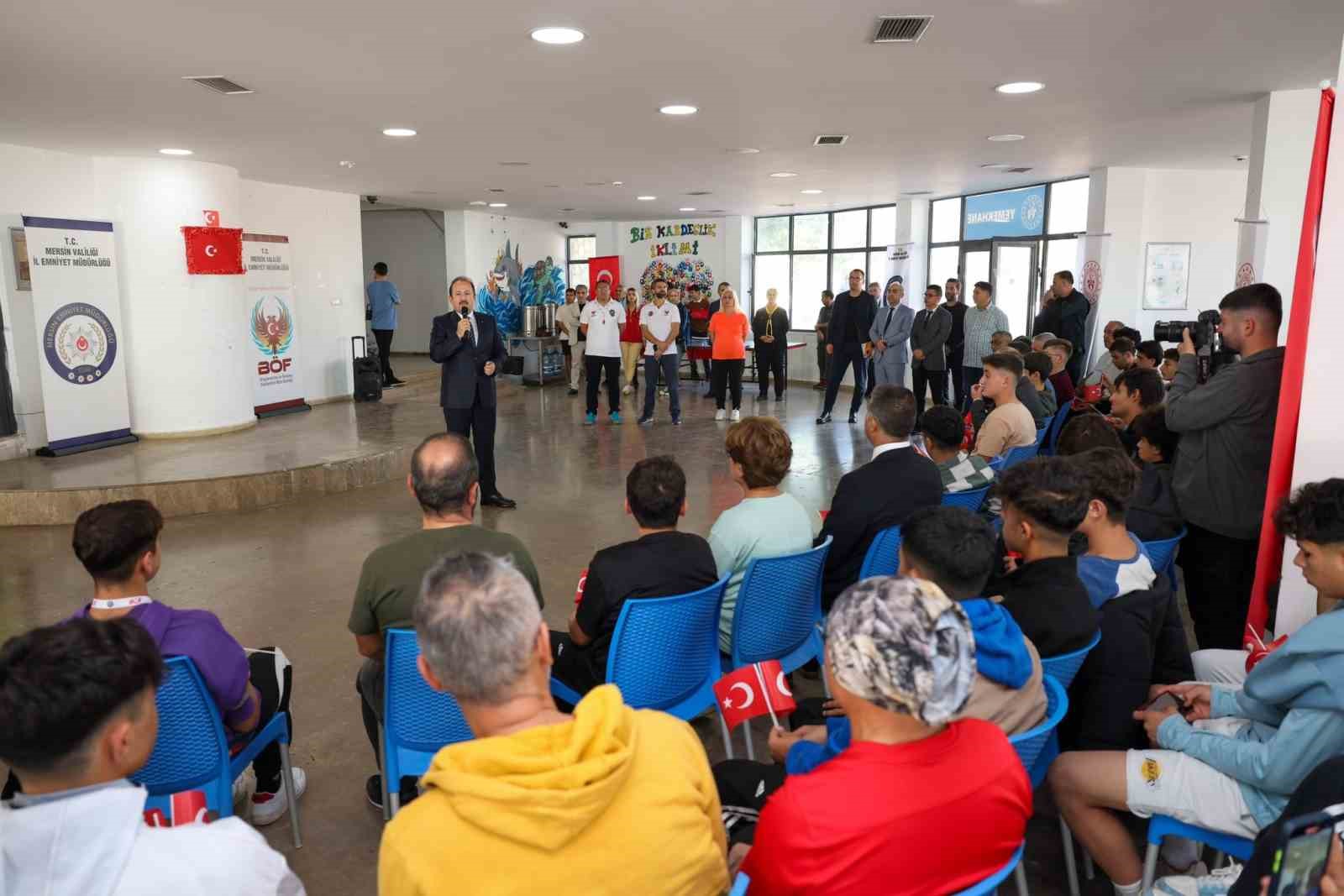 Programa katılan Vali Pehlivan,” Geçtiğimiz Mayıs ayında, Akdeniz Gençliği Deniz Kampında projesi başlatılmış ve sizlerle bir araya gelmiştik. Bugünde, Akdeniz Gençliği Deniz Kampında 2 projesi kapsamında buradayız. Projemiz çok güzel, anlamlı bir uygulama. Projenin amacı, sizlerin farklı bir ortamda sosyalleşmesi ve sosyal aktivite yapmanıza imkân sağlamaktır. Bunu yaparken de hem dinlenmenizi sağlamak hem de işin uzmanı ekiplerimizden, personelimizden, arkadaşlarımızdan muhtelif konularda hayatınızda ihtiyaç duyacağınız bilgi ve tecrübe birikimi sağlayacak hususlarda aydınlatmak, rehberlik etmektir. Bahsedilen konular, bütün çocuklarımız ve gençlerimiz için önem arz eden aile, akran, arkadaşlık ilişkileri gibi konulardır. Evlerde anne babaların yaptığı, okullarımızda da öğretmenlerimizin rehberliğinde ele alınan gençlere edindirmeye çalıştığımız, sizlerin de edindiğiniz tavırlar, davranışlar yaklaşımlardır. Bununla birlikte temel amaçlarımızdan, gayelerimizden birisi de hayata hazırlamaktır. Hayata hazırlıklı bir şekilde yola çıkmanızı, hayat yolunda kendinize güvenerek, öz güvenli ve bilinçli bir şekilde yol almamızı sağlamaktır. İster ilmi ister fenni ister sosyal hangi konu olursa olsun, yaşamımıza dair hususlarda ne kadar bilgiliysek o kadar kendinizi güçlü hissederiz. Ya yaşayarak öğreneceğiz ya da yaşayanlardan öğreneceğiz. Biz ikisini birlikte yapalım istiyoruz” diye konuştu.